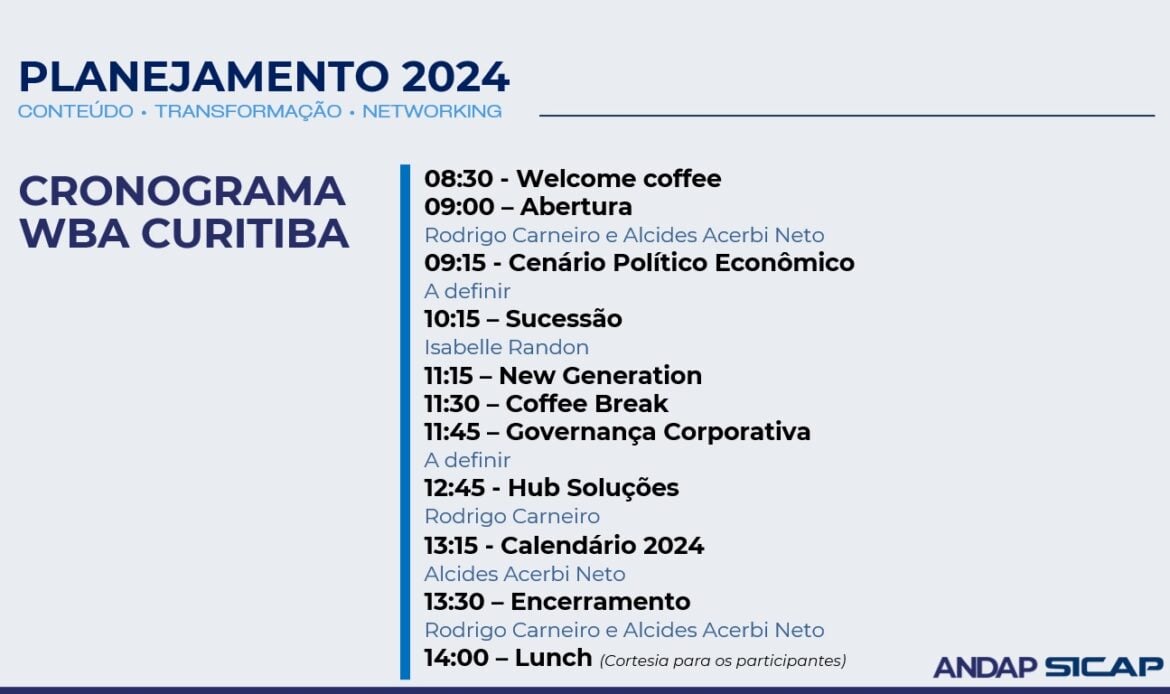 | O WBA Curitiba foi remarcado para 9 de maio, na Fecomércio do Paraná. Esta será uma oportunidade única de começar o dia com um rico networking e conhecimentos valiosos para o nosso setor. Para aqueles que estarão presentes na Feira Autopar, que ocorrerá de 8 a 11 de maio, este evento representa uma excelente oportunidade para criar sinergias. Ele reúne especialistas e associados de todo o Brasil, proporcionando um momento exclusivo de troca e aprendizados. |