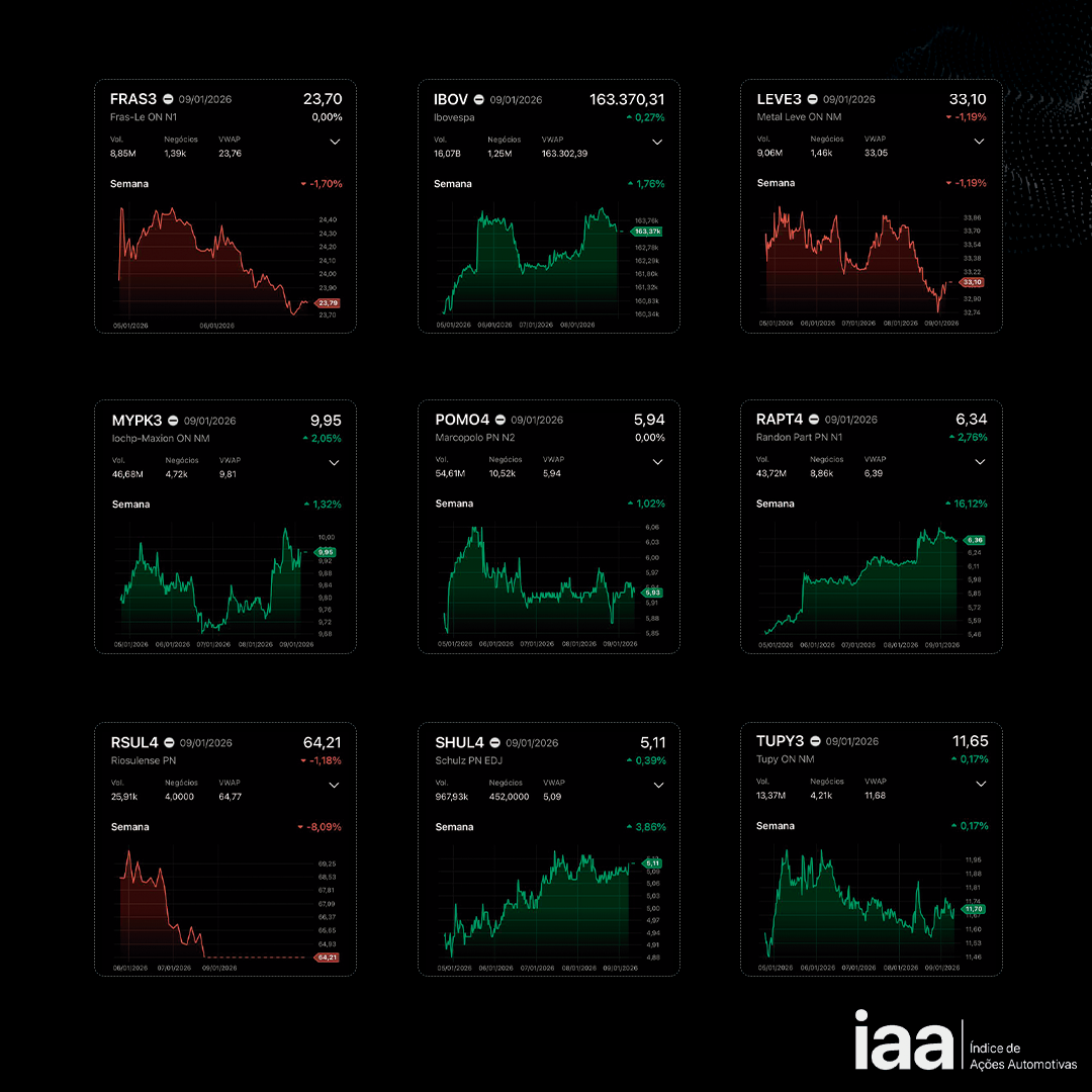O clima de otimismo que marcou os negócios na Bolsa de Valores de São Paulo, resultado do anúncio dos dados da inflação oficial do Brasil que encerrou 2025 abaixo da meta e os do emprego nos EUA, repercutiu positivamente nos ativos. O Ibovespa, principal índice acionário do País, fechou em alta de +1,76%. Enquanto o IAA, que mede o desempenho da carteira automotiva, fechou em +1,44%.
