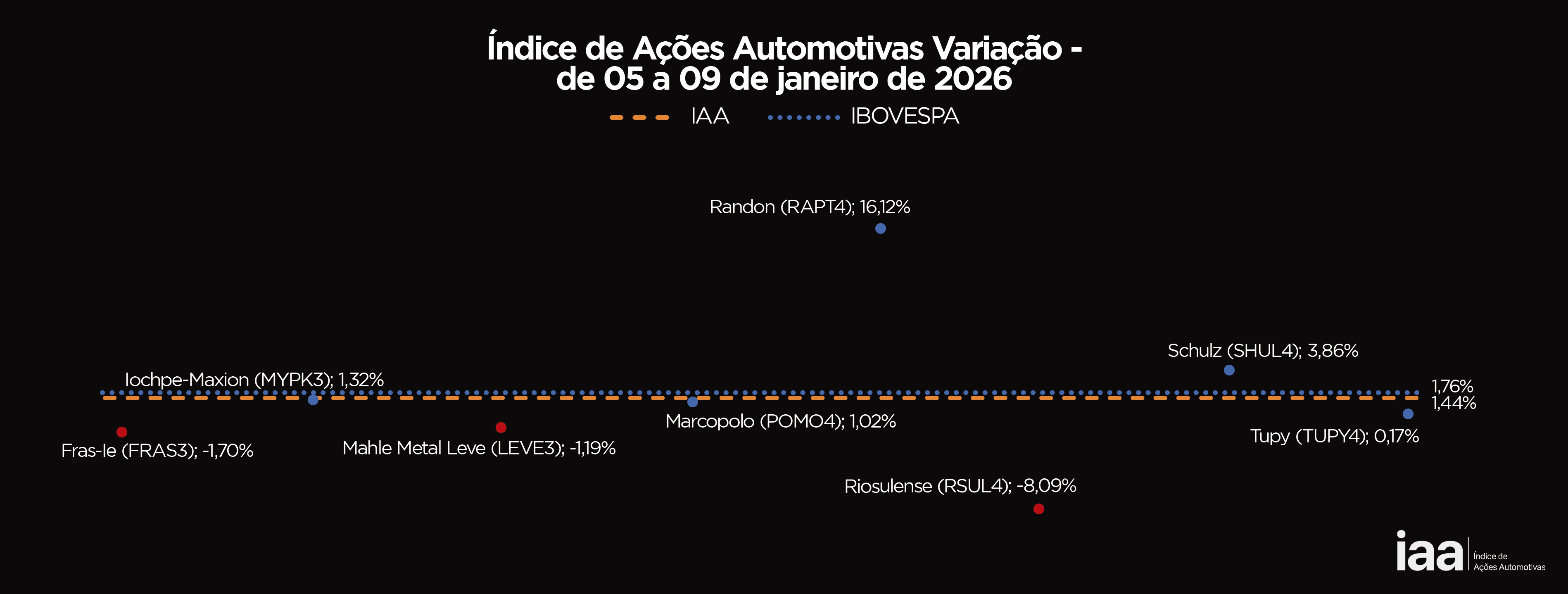O IAA é o índice criado pelo After.Lab para medir as movimentações nas ações das empresas do setor automotivo listadas em Bolsa. Mesmo que ainda sejam poucas as empresas a operar nessa modalidade, já são suficientes para proporcionar uma leitura sobre o desempenho das operações relacionadas ao universo automotivo que abriram capital e usam o pregão do Ibovespa para conquistar investidores e alavancarem seus negócios.