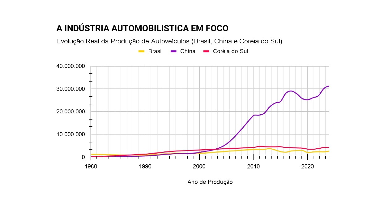 Em 1980, a indústria automobilística brasileira produziu 1,16 milhão de veículos, enquanto a coreana fabricou 123 mil unidades e a chinesa, 220 mil. Historicamente, a produção brasileira era 5.5 vezes maior que a da China e da Coreia do Sul, e o triplo da soma de ambas. No entanto, o cenário atual é completamente distinto: a China agora produz mais de 31 milhões de automóveis por ano, a Coreia do Sul 4,1 milhões, enquanto o Brasil se limita a 2,6 milhões.