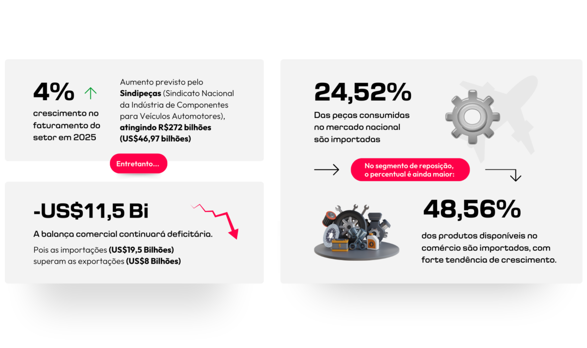 Atualmente, aproximadamente 24,52% das peças consumidas no mercado nacional são importadas. No segmento de reposição, esse percentual é ainda maior: mais de 48,56% dos produtos disponíveis no comércio são importados, com forte tendência de crescimento.