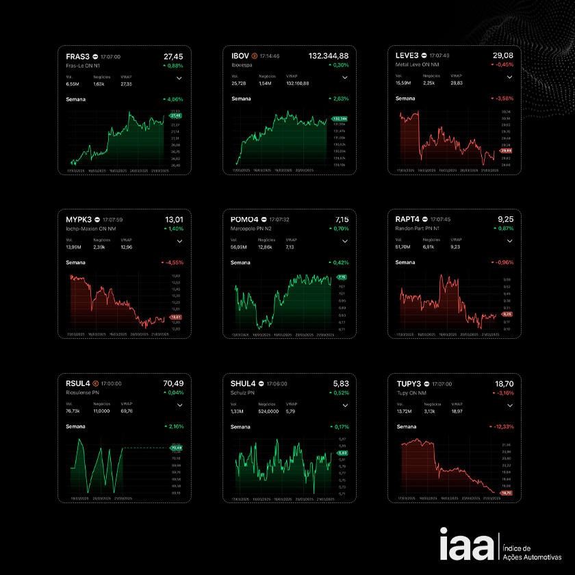 O IAA é o índice criado pelo After.Lab para medir as movimentações nas ações das empresas do setor automotivo listadas em Bolsa. Mesmo que ainda sejam poucas as empresas a operar nessa modalidade, já são suficientes para proporcionar uma leitura sobre o desempenho das operações relacionadas ao universo automotivo que abriram capital e usam o pregão do Ibovespa para conquistar investidores e alavancarem seus negócios.