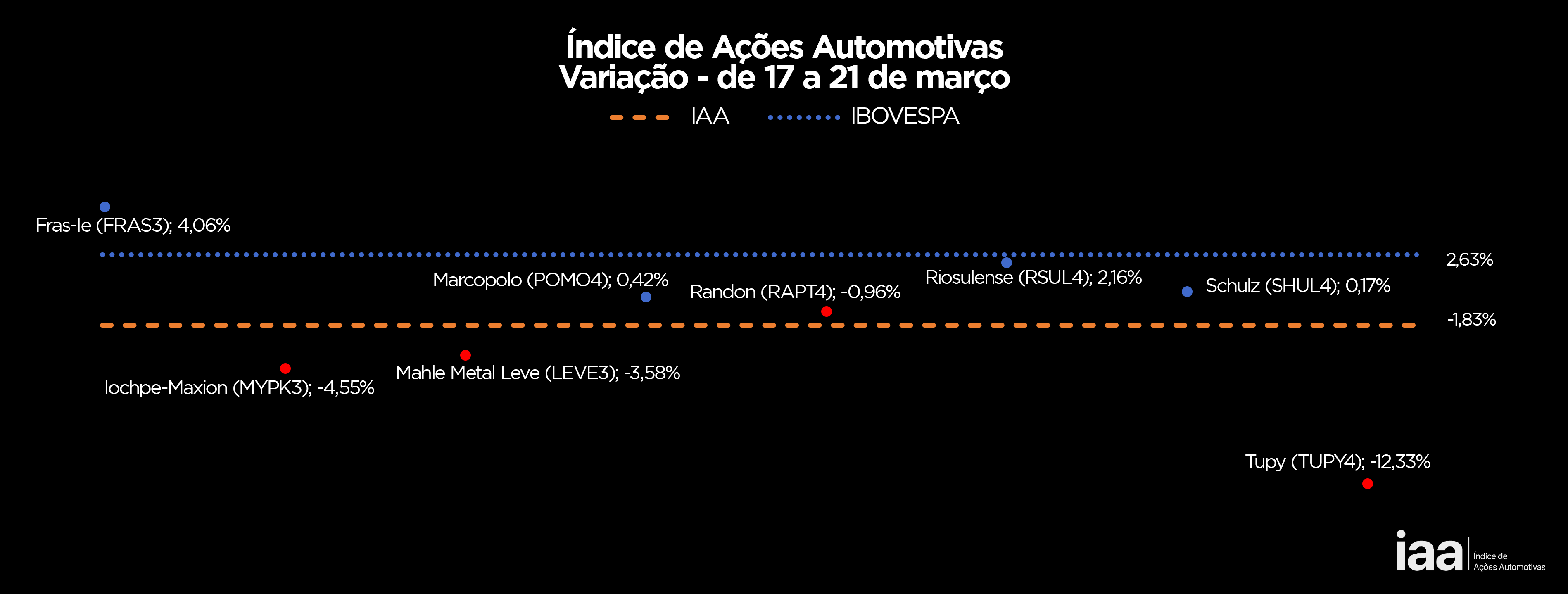 O IAA, por sua vez, registrou uma queda de -1,83%.  O índice que mede o desempenho das ações automotivas na Bolsa, sofreu, sobretudo. com a desvalorização da Tupy (TUPY4) -12,33%.