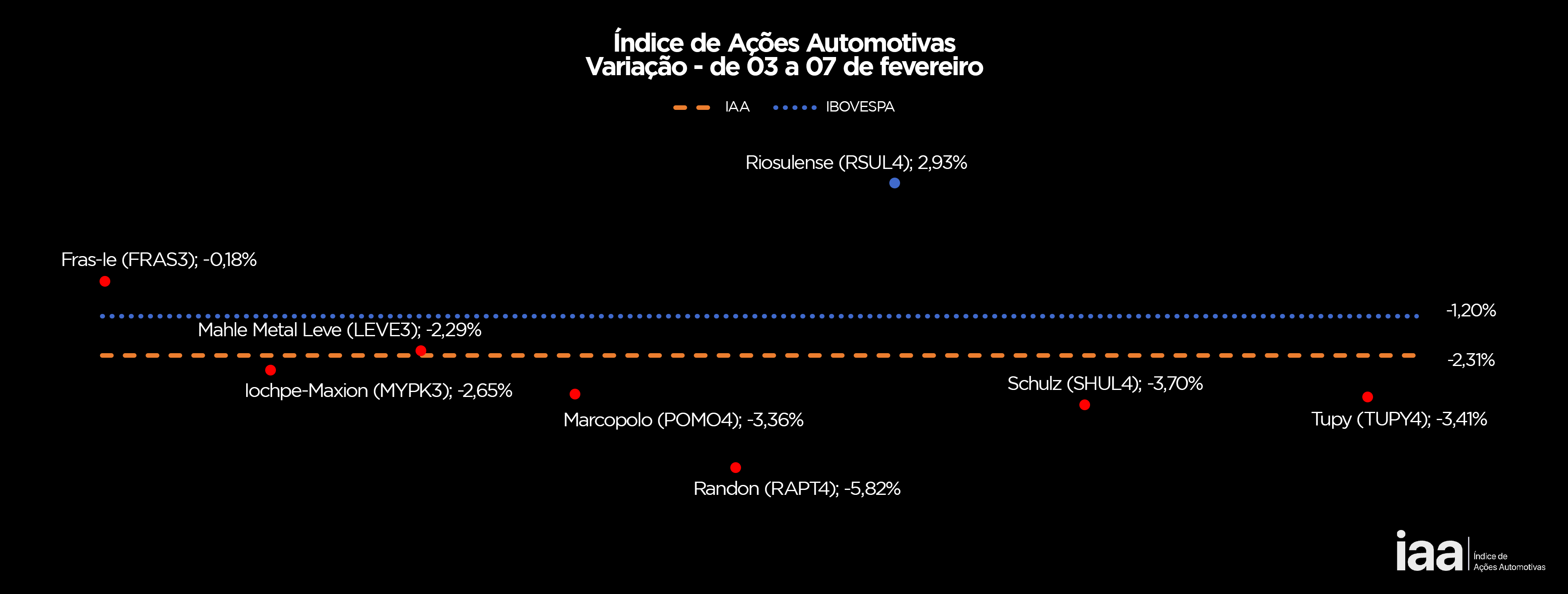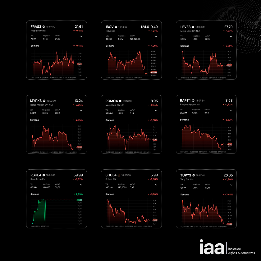 A primeira semana de fevereiro interrompeu uma sequência de resultados positivos na Bolsa de Valores de São Paulo. Enquanto o Ibovespa encerrou o período com queda de -1,20%; o IAA, Índice que mede o desempenho das ações automotivas, ficou em -2,31%.