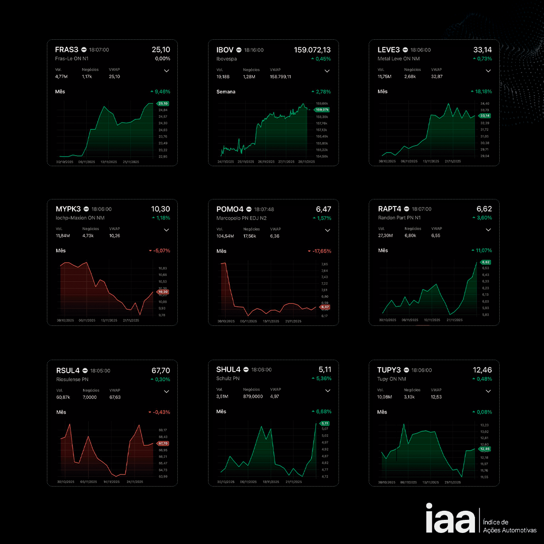 O IAA é o índice criado pelo After.Lab para medir as movimentações nas ações das empresas do setor automotivo listadas em Bolsa. Mesmo que ainda sejam poucas as empresas a operar nessa modalidade, já são suficientes para proporcionar uma leitura sobre o desempenho das operações relacionadas ao universo automotivo que abriram capital e usam o pregão do Ibovespa para conquistar investidores e alavancarem seus negócios.