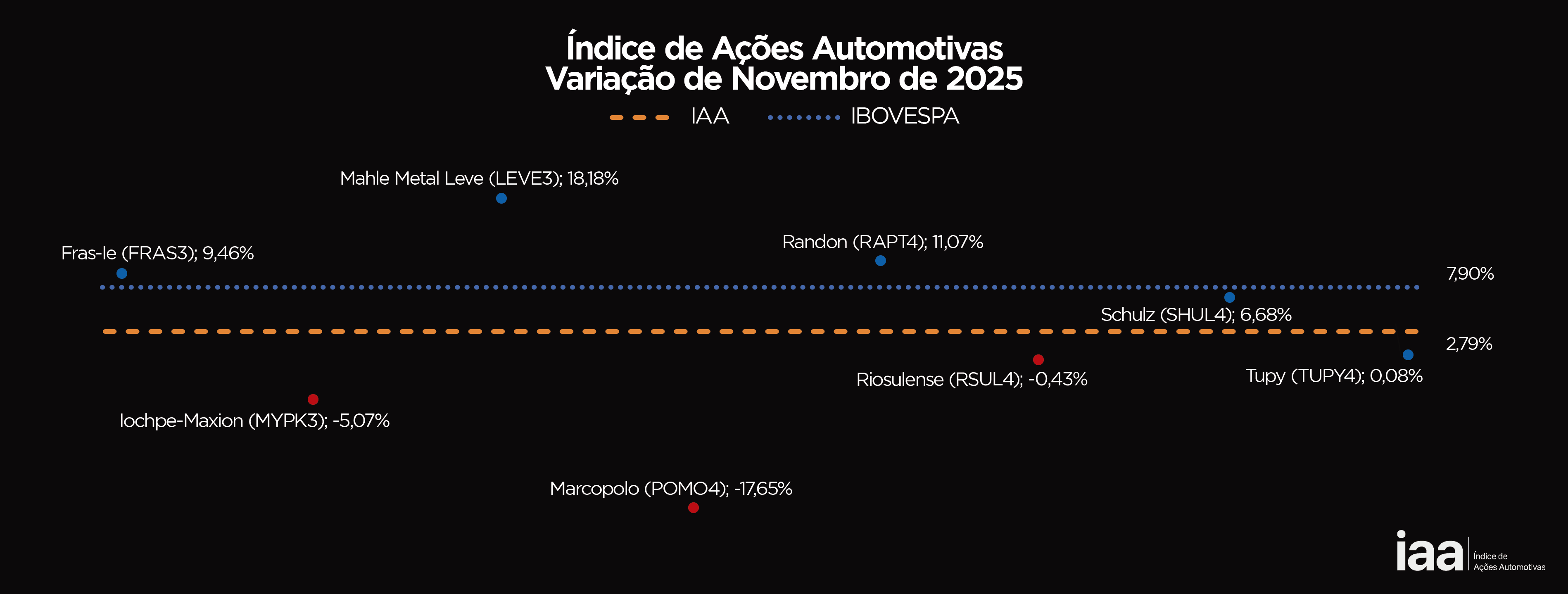 No mês em que o Ibovespa renovou a máxima histórica, puxada principalmente por Vale e Itaú, que anunciarem dividendos bilionários, a Bolsa acumulou alta de +7,90%. O IAA seguiu na mesma direção e fechou em +2,79%, com destaque para as ações da Mahle Metal Leve (LEVE3) +18, 18%; Randon (RAPT4) +11,07%; Fras-le (FRAS3) +9,46%; Schulz (SHUL4) +6,68% e Tupy(TUPY4) +0,08%