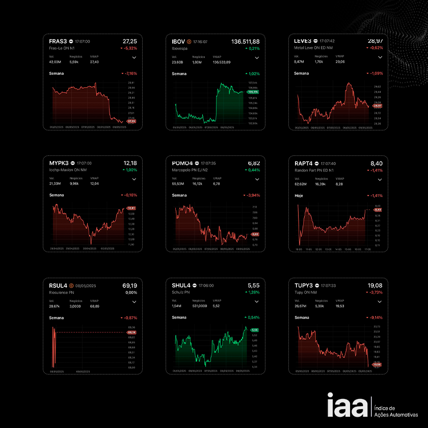 O IAA é o índice criado pelo After.Lab para medir as movimentações nas ações das empresas do setor automotivo listadas em Bolsa. Mesmo que ainda sejam poucas as empresas a operar nessa modalidade, já são suficientes para proporcionar uma leitura sobre o desempenho das operações relacionadas ao universo automotivo que abriram capital e usam o pregão do Ibovespa para conquistar investidores e alavancarem seus negócios.