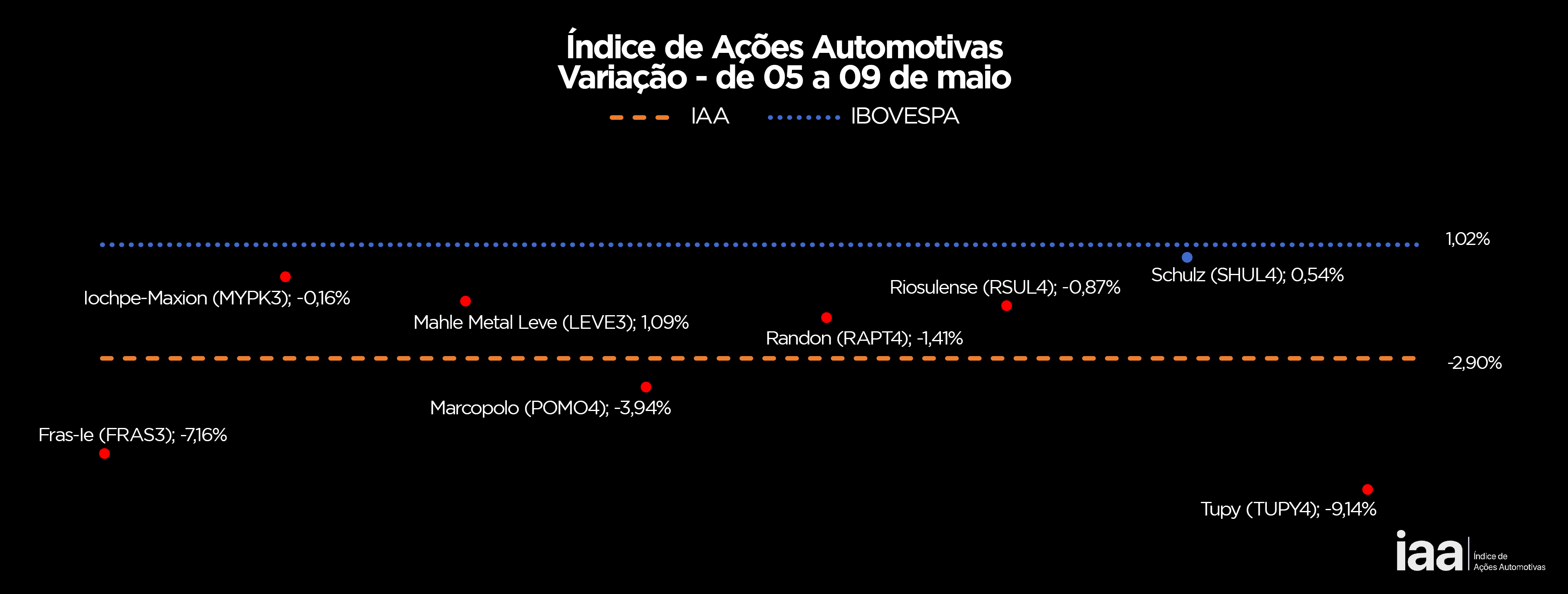 O período de 05 a 09 de maio não foi positivo para as ações automotivas listadas na Bolsa de Valores de São Paulo. Após o bom desempenho da carteira nas últimas semanas, o IAA fechou em queda de -2,90%, não acompanhando a valorização de +1,02% do Ibovespa.