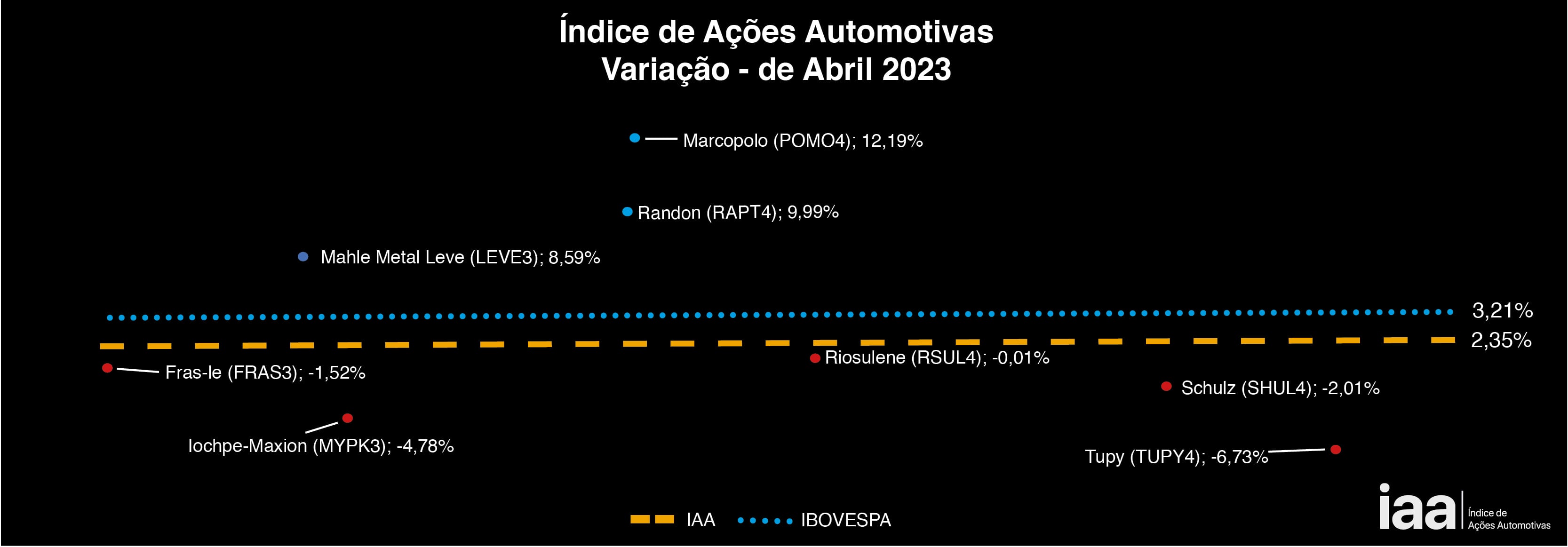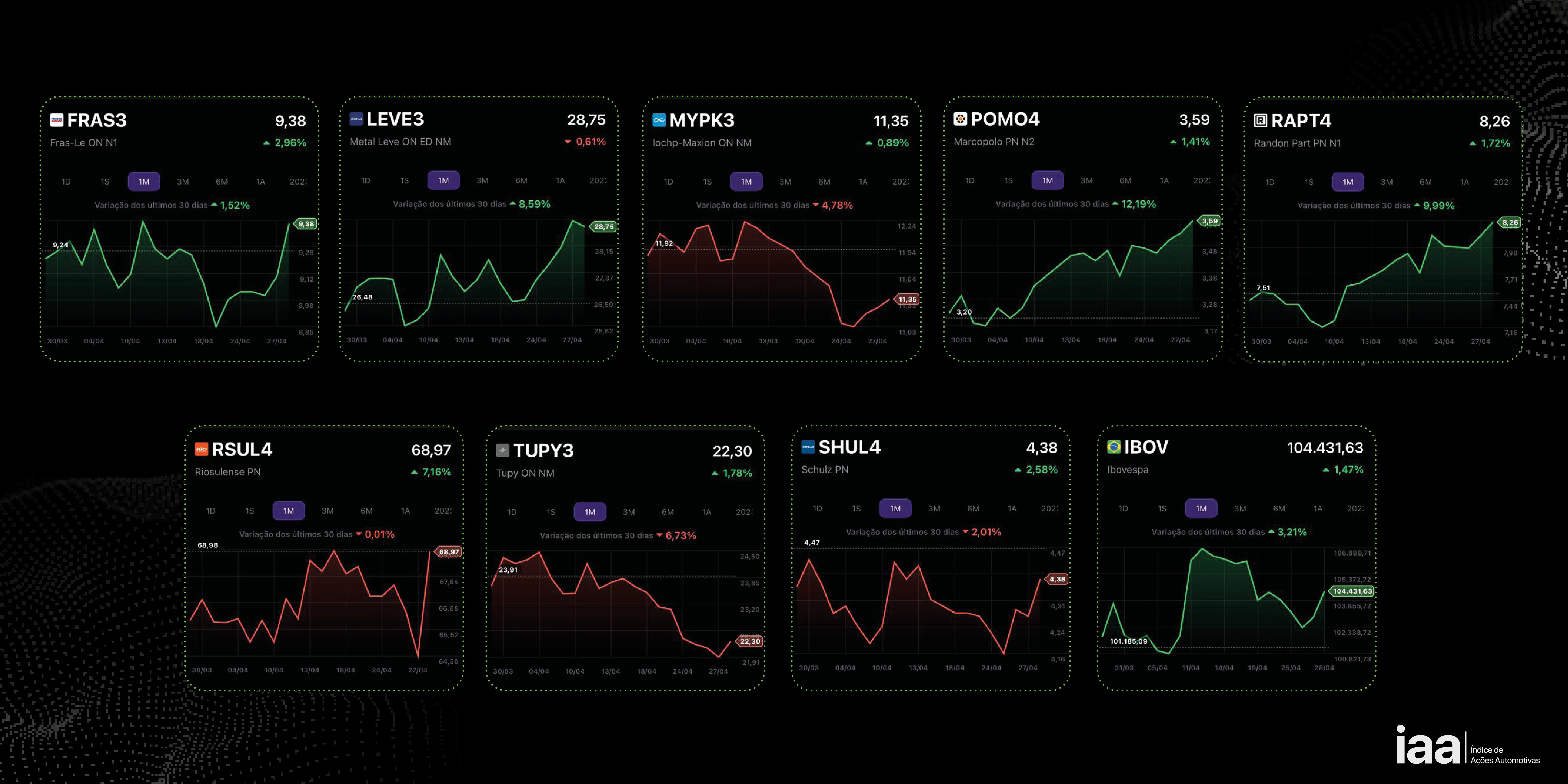 O IAA é o novo índice criado pela Plataforma Automotiva para medir movimentações nas ações do segmento listadas em Bolsa. Mesmo que ainda sejam poucas as empresas a operar nessa modalidade, já são suficientes para proporcionar uma leitura sobre o desempenho das operações relacionadas ao universo automotivo que abriram capital e usam o pregão do Ibovespa para conquistar investidores e alavancarem seus negócios.