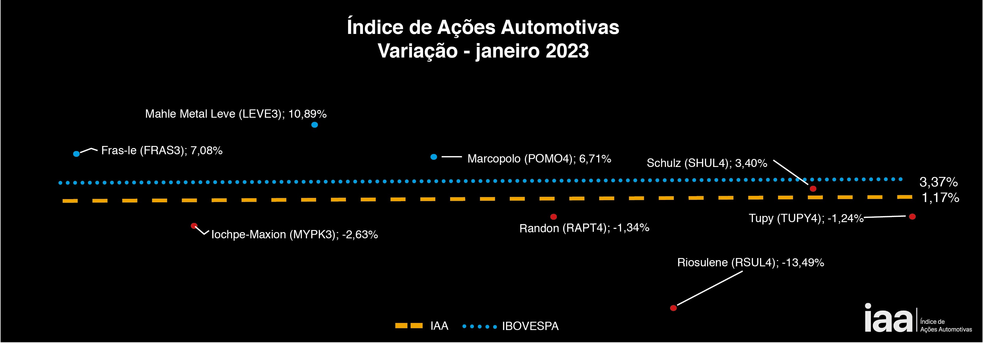 Embora em um primeiro momento o cenário político brasileiro tenha impactado de forma negativa o mercado financeiro no início do ano, as ações negociadas na Bolsa de Valores de São Paulo encerraram o mês de janeiro com resultados positivos. No período, o Ibovespa fechou em 3, 37%, enquanto as ações automotivas, que compõem o IAA tiveram variação de 1, 17%.