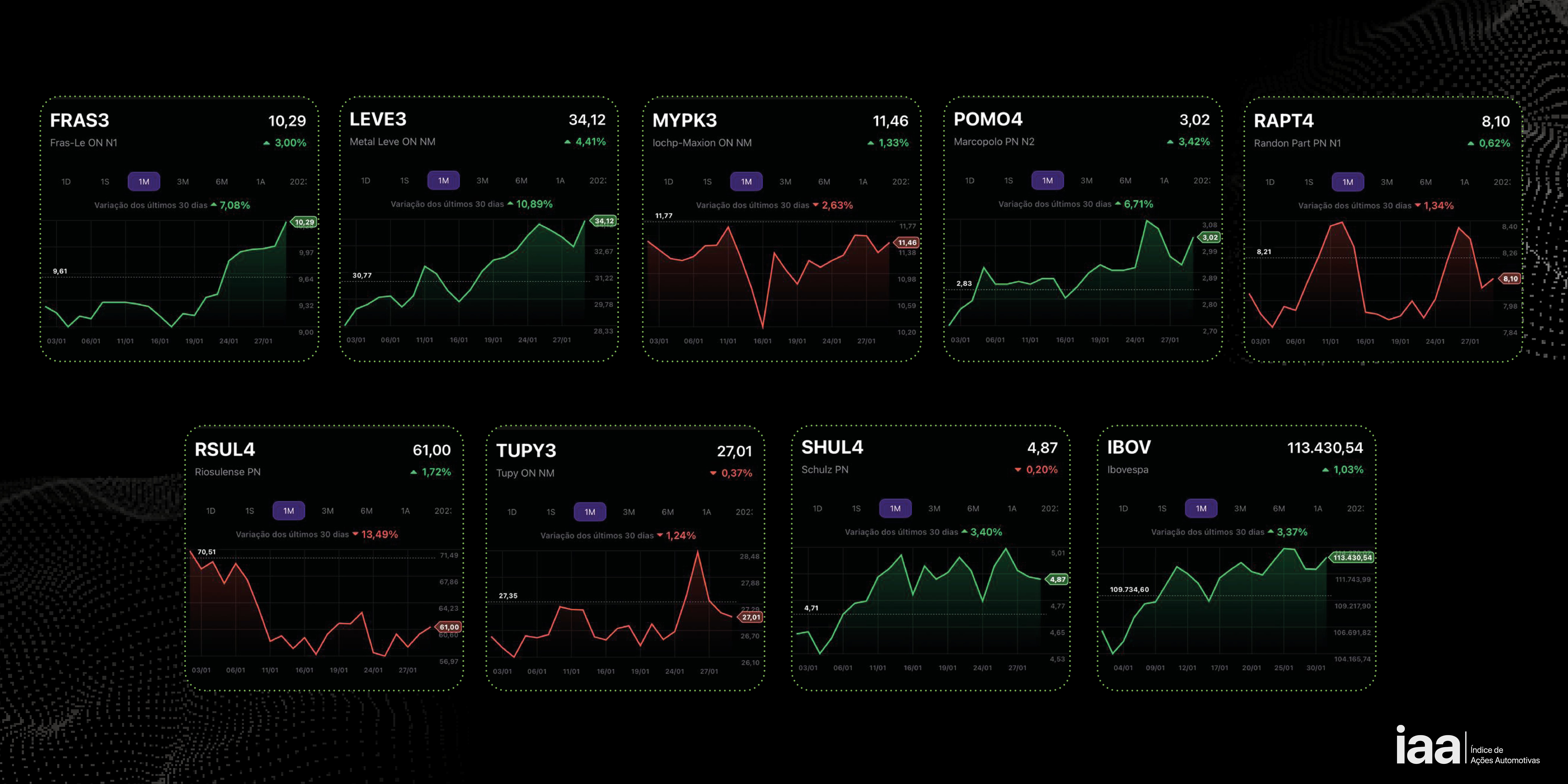 O IAA é o novo índice criado pela Plataforma Automotiva para medir movimentações nas ações do segmento listadas em Bolsa. Mesmo que ainda sejam poucas as empresas a operar nessa modalidade, já são suficientes para proporcionar uma leitura sobre o desempenho das operações relacionadas ao universo automotivo que abriram capital e usam o pregão do Ibovespa para conquistar investidores e alavancarem seus negócios.