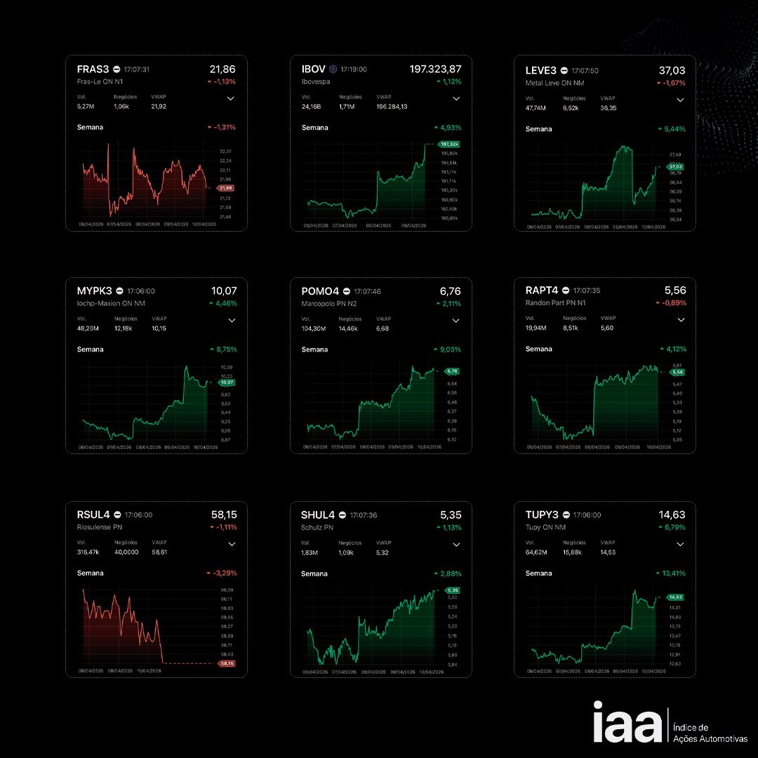 Puxada pelo desempenho da Tupy (TUPY4) +13,41%, a alta na carteira automotiva reflete a retomada de confiança nos ativos brasileiros. Outras ações também registraram desempenhos positivos: Marcopolo(POMO4) +9,03%; Iochpe-Maxion (MYPK3) +8,75%; Mahle Metal Leve (LEVE3) +5,44%; Randon (RAPT4) +4,12% e Schulz (SHUL4) +2,88%.