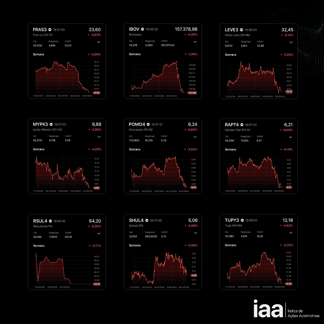 O IAA é o índice criado pelo After.Lab para medir as movimentações nas ações das empresas do setor automotivo listadas em Bolsa. Mesmo que ainda sejam poucas as empresas a operar nessa modalidade, já são suficientes para proporcionar uma leitura sobre o desempenho das operações relacionadas ao universo automotivo que abriram capital e usam o pregão do Ibovespa para conquistar investidores e alavancarem seus negócios.
