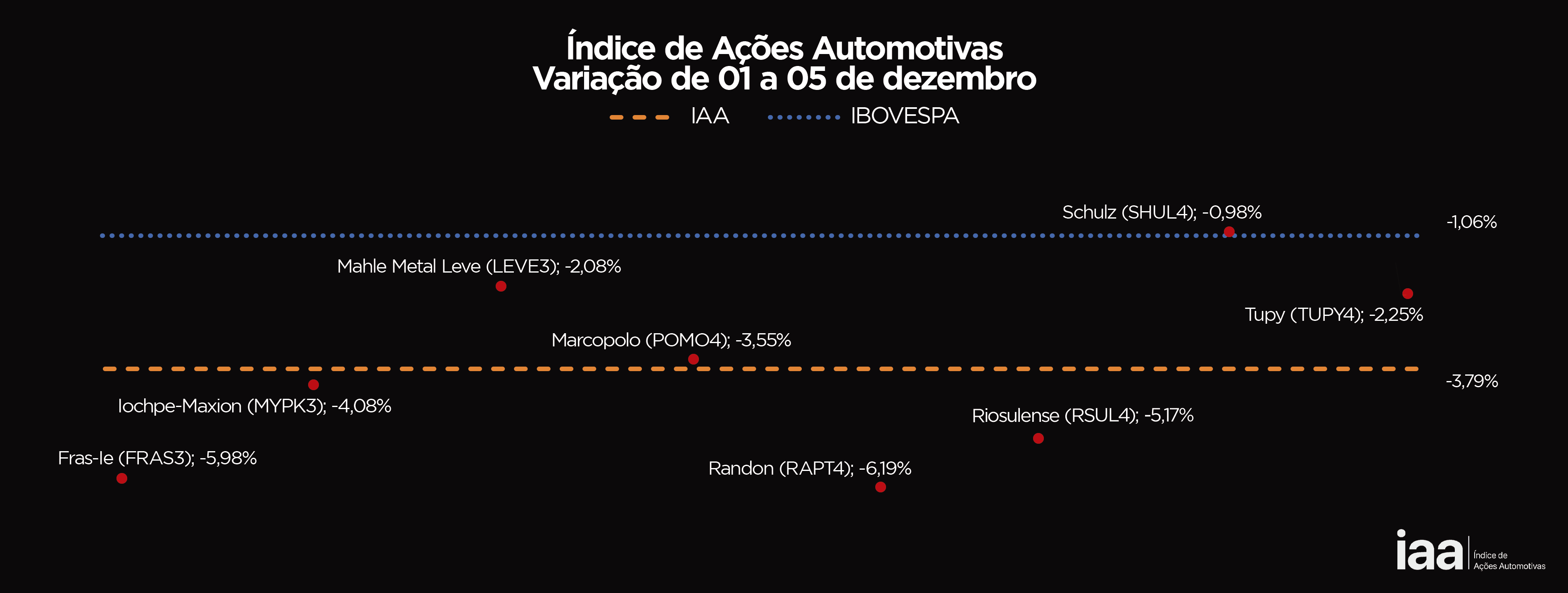 No período, todas as ações que compõem a carteira automotiva perderam valor: Schulz (SHUL4) -0,98%; Mahle Metal Leve (LEVE3) -2,08%; Tupy(TUPY4) -2,25%; Marcopolo(POMO4) –3,55%; Iochpe-Maxion (MYPK3) -4,08%; Riosulense (RSUL4) -5,17%; Fras-le (FRAS3) –5,98% e Randon (RAPT4) -6,19%.