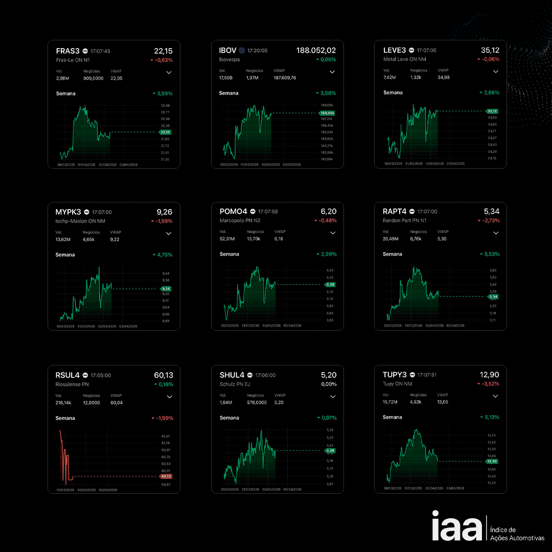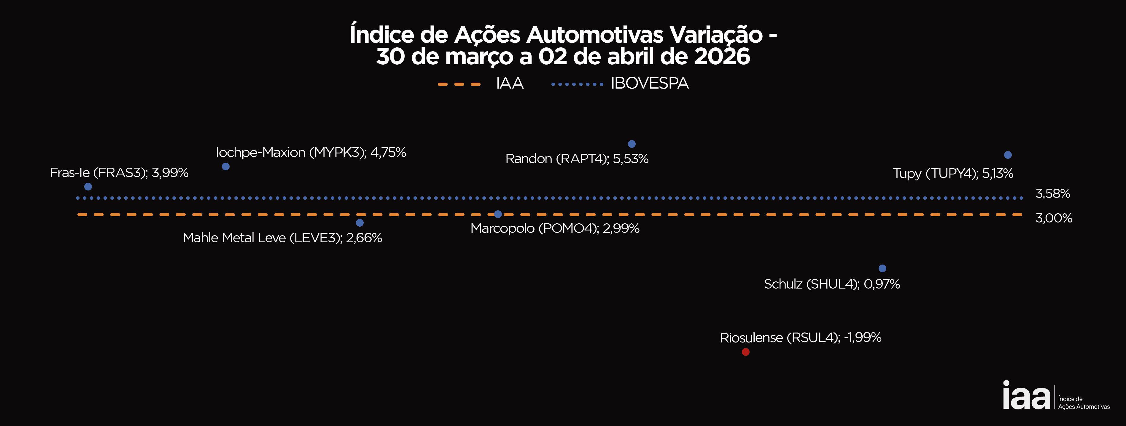 Após uma série de resultados negativos, as ações automotivas voltaram a subir e o IAA, índice que mede o desempenho da carteira automotiva, encerrou a semana de 30 de março a 6 de abril em alta de +3,00%.