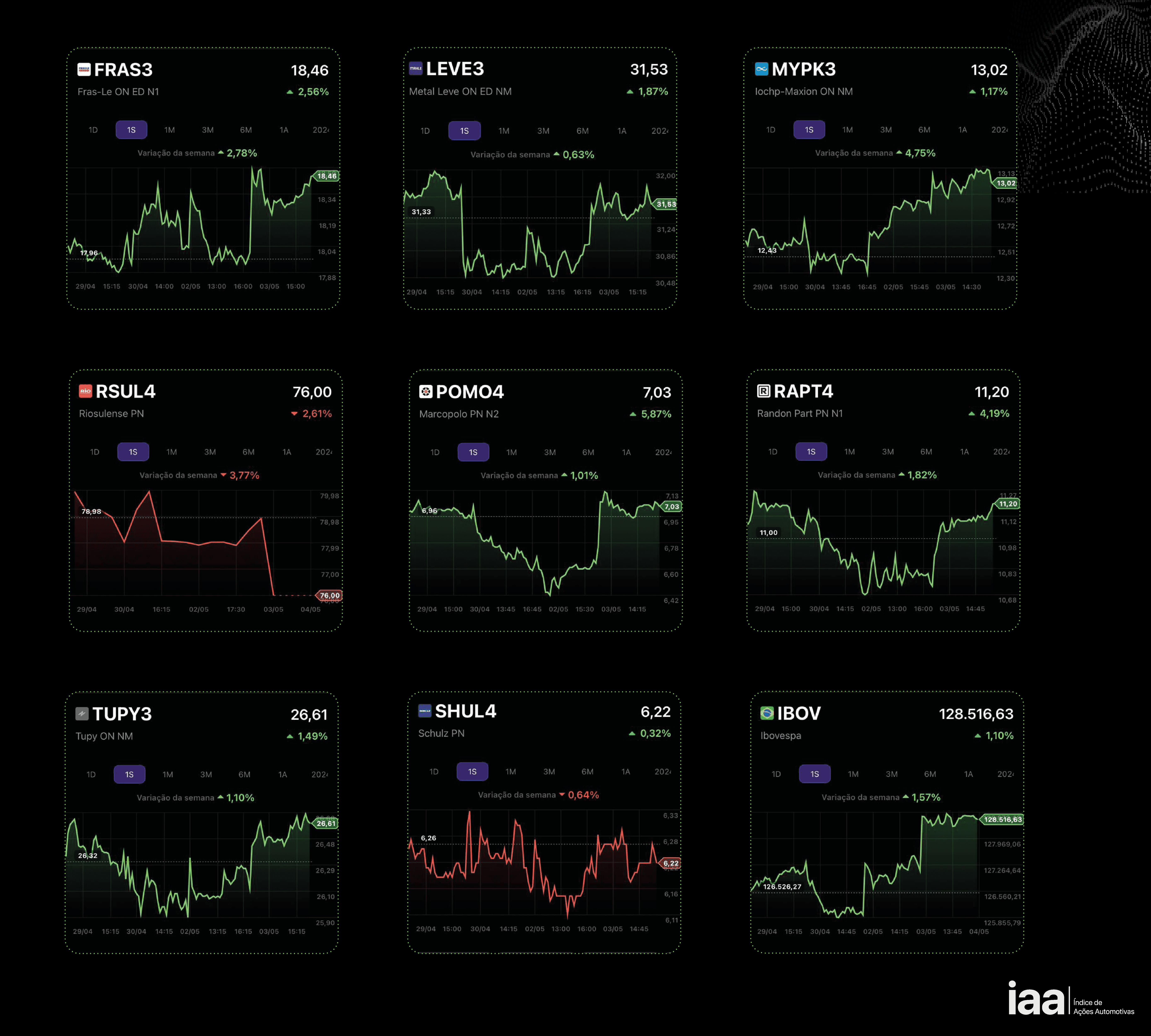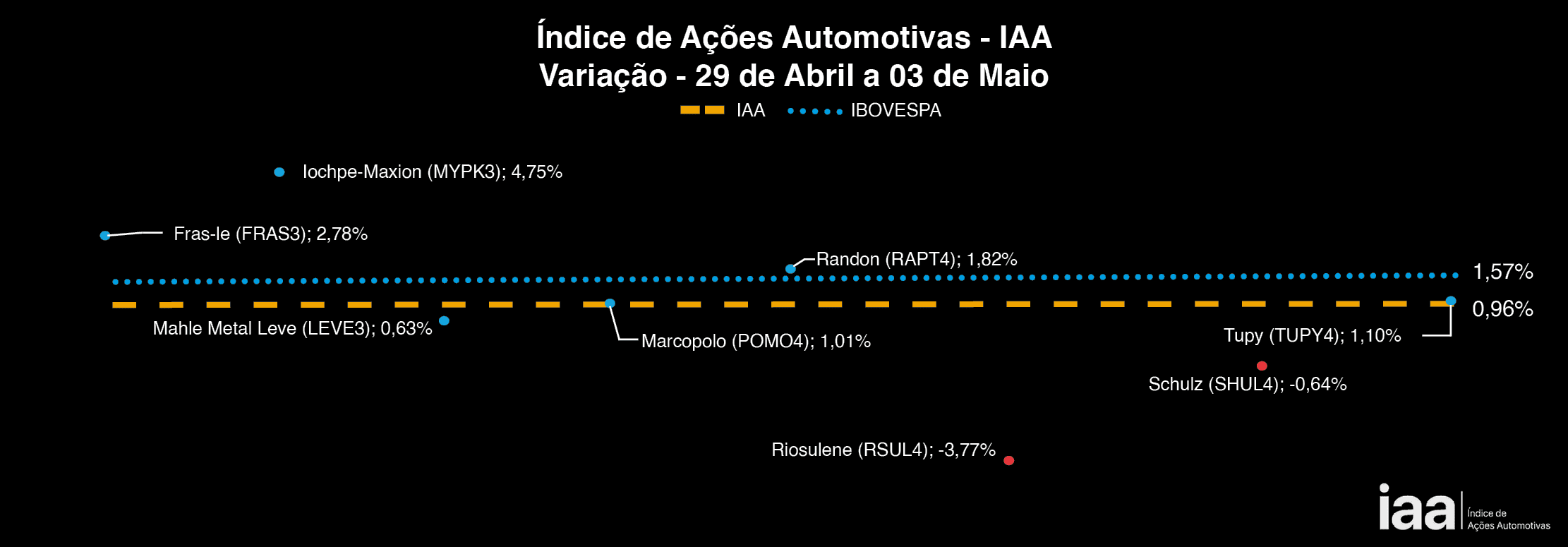 O IAA é o novo índice criado pela Plataforma Automotiva para medir movimentações nas ações do segmento listadas em Bolsa. Mesmo que ainda sejam poucas as empresas a operar nessa modalidade, já são suficientes para proporcionar uma leitura sobre o desempenho das operações relacionadas ao universo automotivo que abriram capital e usam o pregão do Ibovespa para conquistar investidores e alavancarem seus negócios.