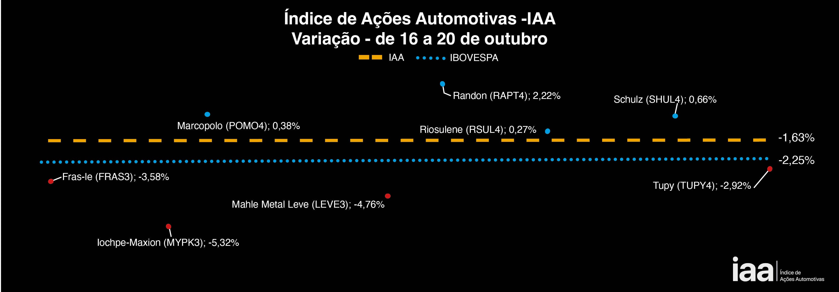 Apesar da melhoria no desempenho das ações automotivas negociadas na Bolsa de Valores de São Paulo, o IAA permaneceu negativo na semana de 16 a 20 de outubro.  O bom resultado, comparado com o da semana anterior, ainda não foi suficiente para elevar o Índice, que encerrou a semana em -1,63%, enquanto o ibovespa ficou em -2,25% reflexos das turbulências externas.