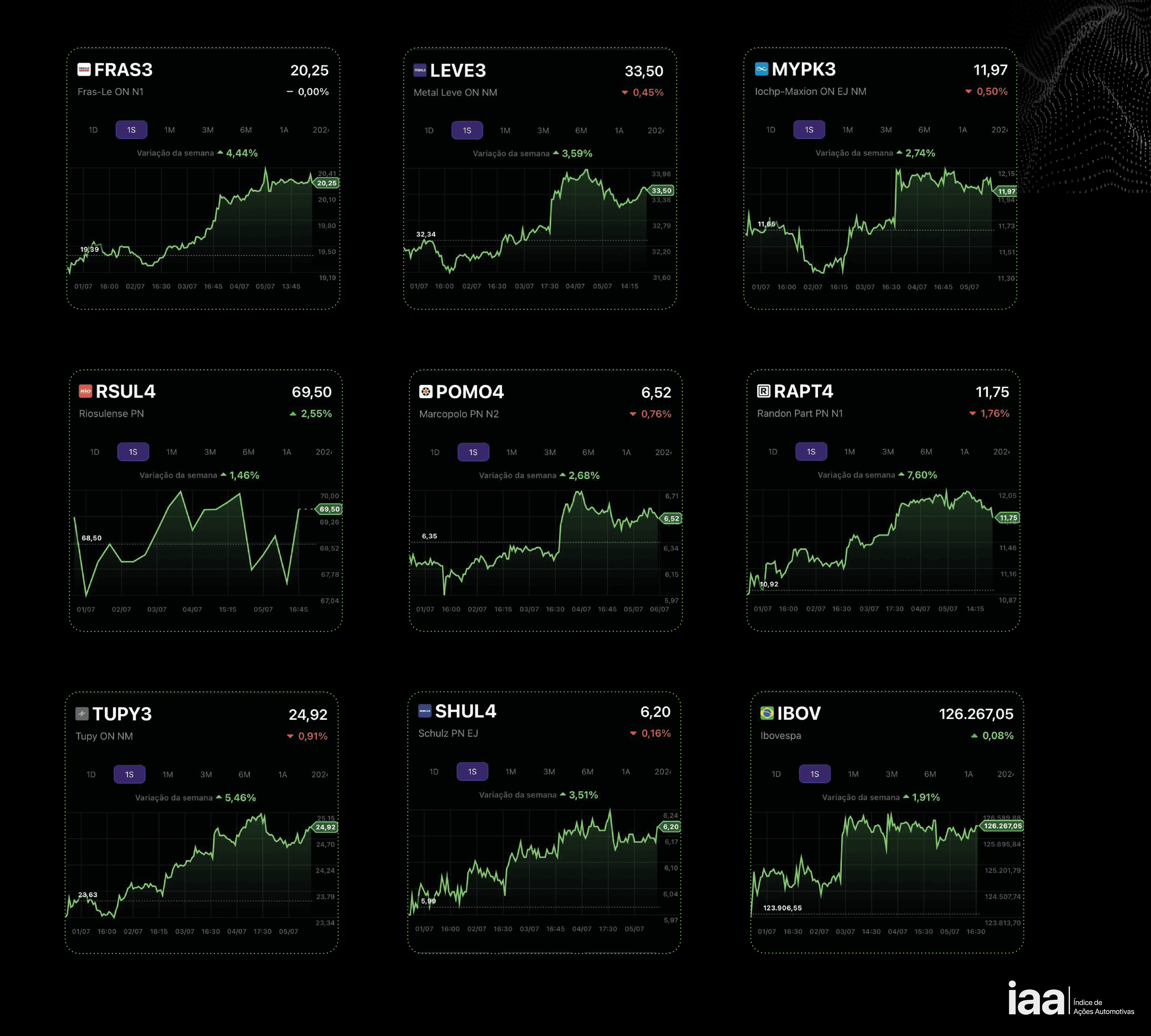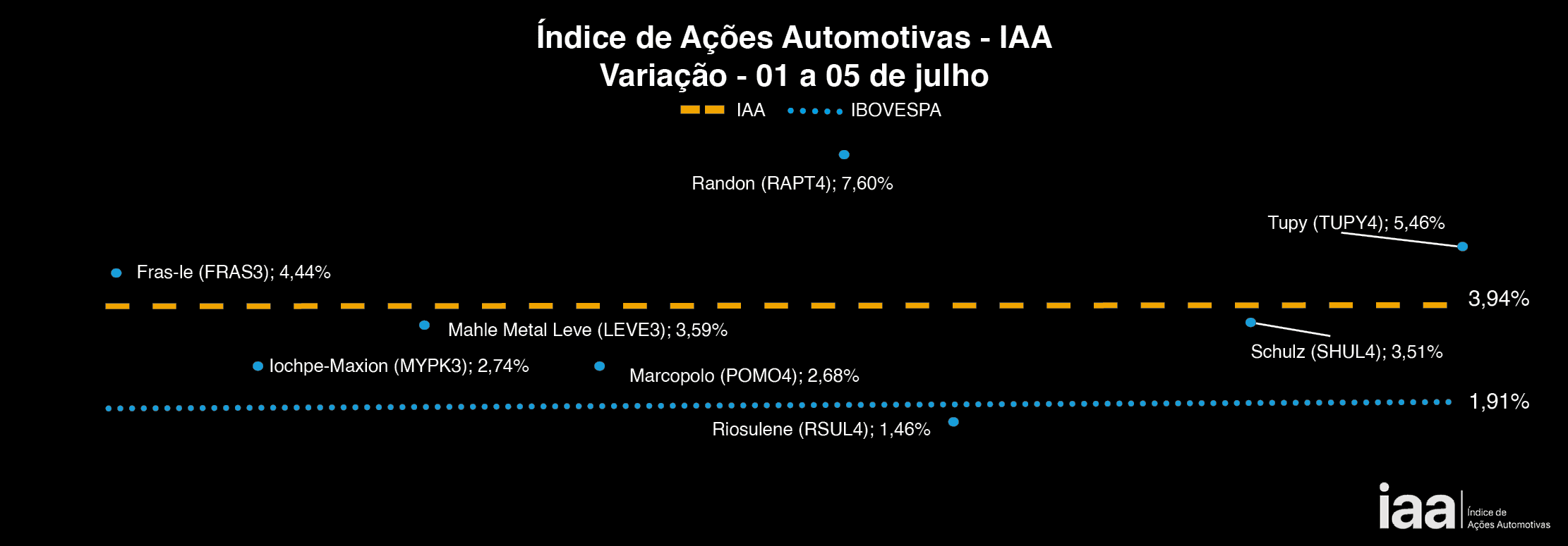 As ações automotivas negociadas na Bolsa de Valores de São Paulo continuam em uma maré favorável. Há três semanas, o IAA, índice que mede o desempenho desses ativos, está positivo e supera o Ibovespa, principal indicador do mercado financeiro nacional. O IAA encerrou a semana em +3,94%; enquanto o Ibovespa ficou em +1,91%.