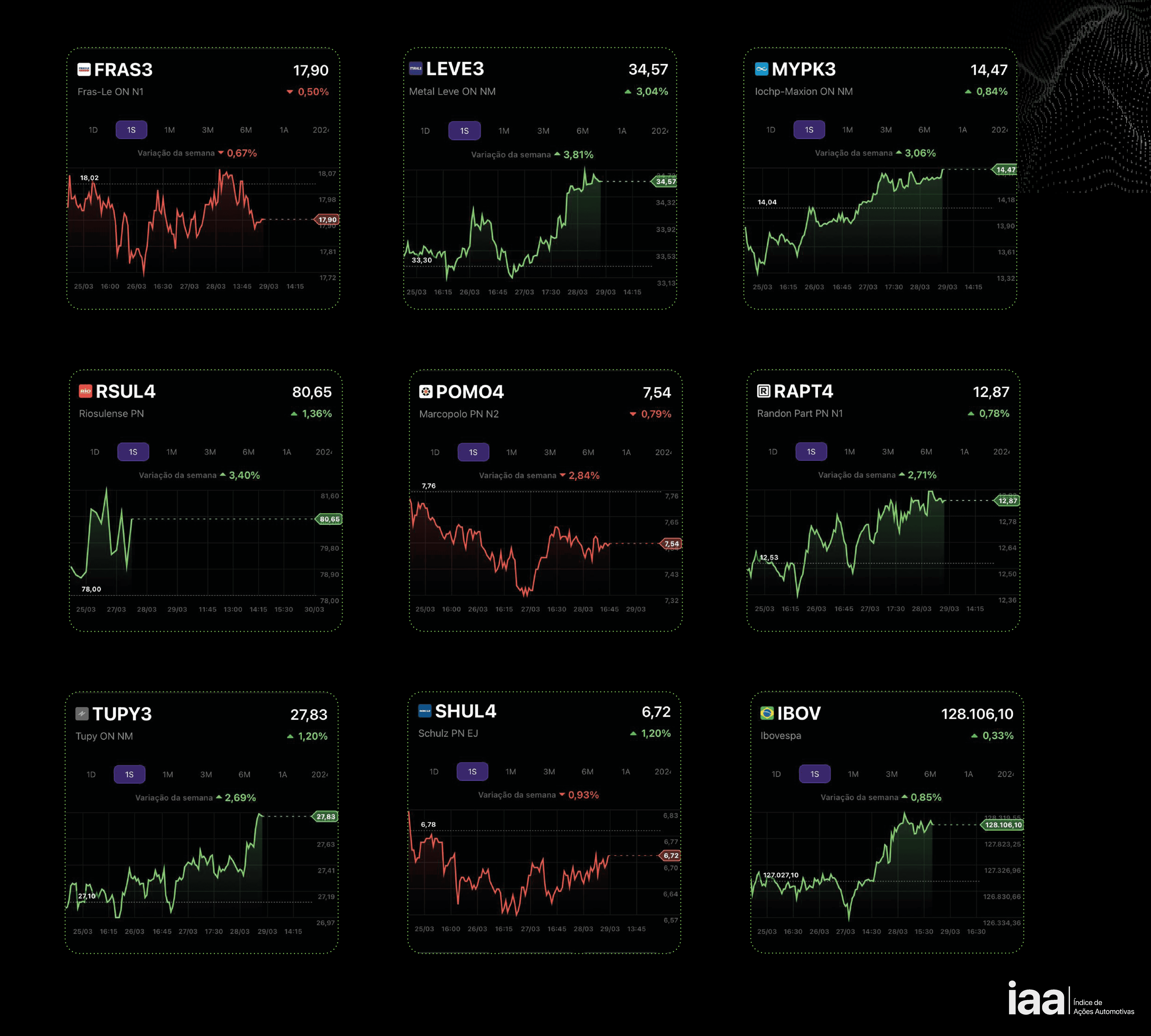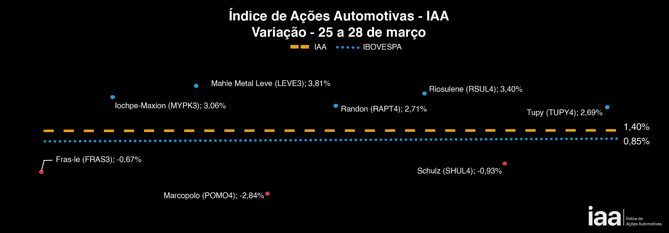 Em mais uma semana consecutiva, as empresas automotivas com ações negociadas na Bolsa de Valores de São Paulo tiveram resultados positivos. O IAA, índice que mede o desempenho dessas companhias, encerrou o período de 25 a 28 de março em 1,40%, superando mais uma vez o ibovespa que ficou em 0,85%.