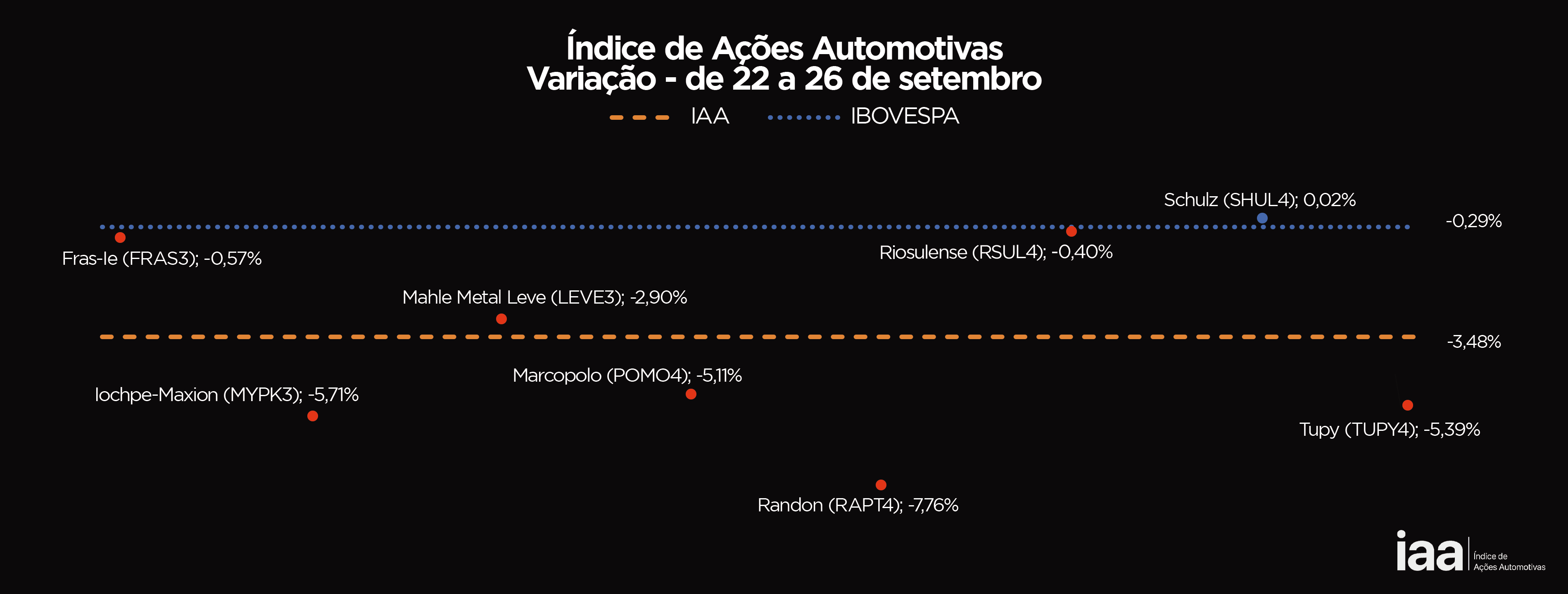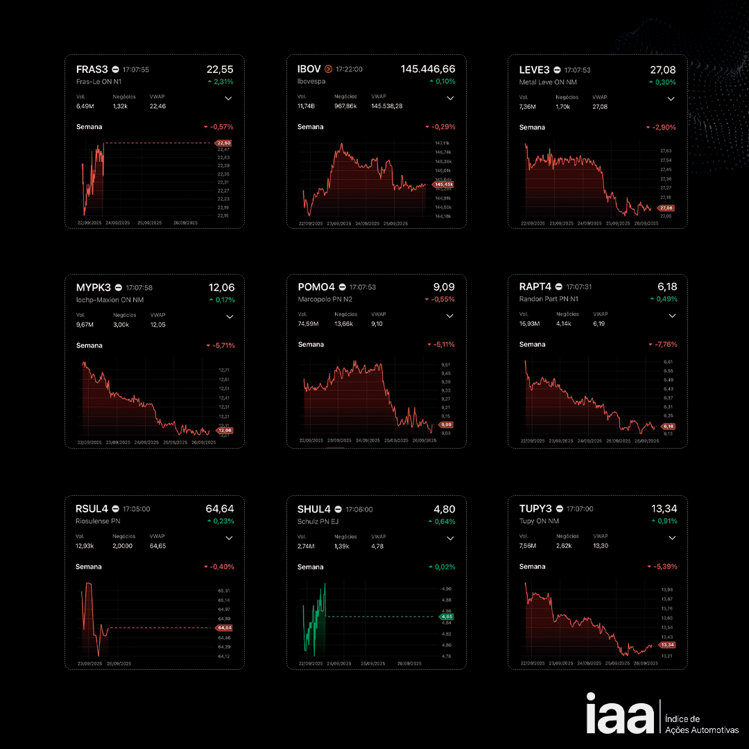 Em um cenário desafiador em meio ao aumento das autopeças chinesas no País e a expectativas de novas sanções norte-americanas a produtos brasileiros, todas as ações que compõem o IAA desvalorizaram no período. Exceto as da Schulz (SHUL4) que fechou em estabilidade de +0,02%, todas as demais registraram variações negativas: