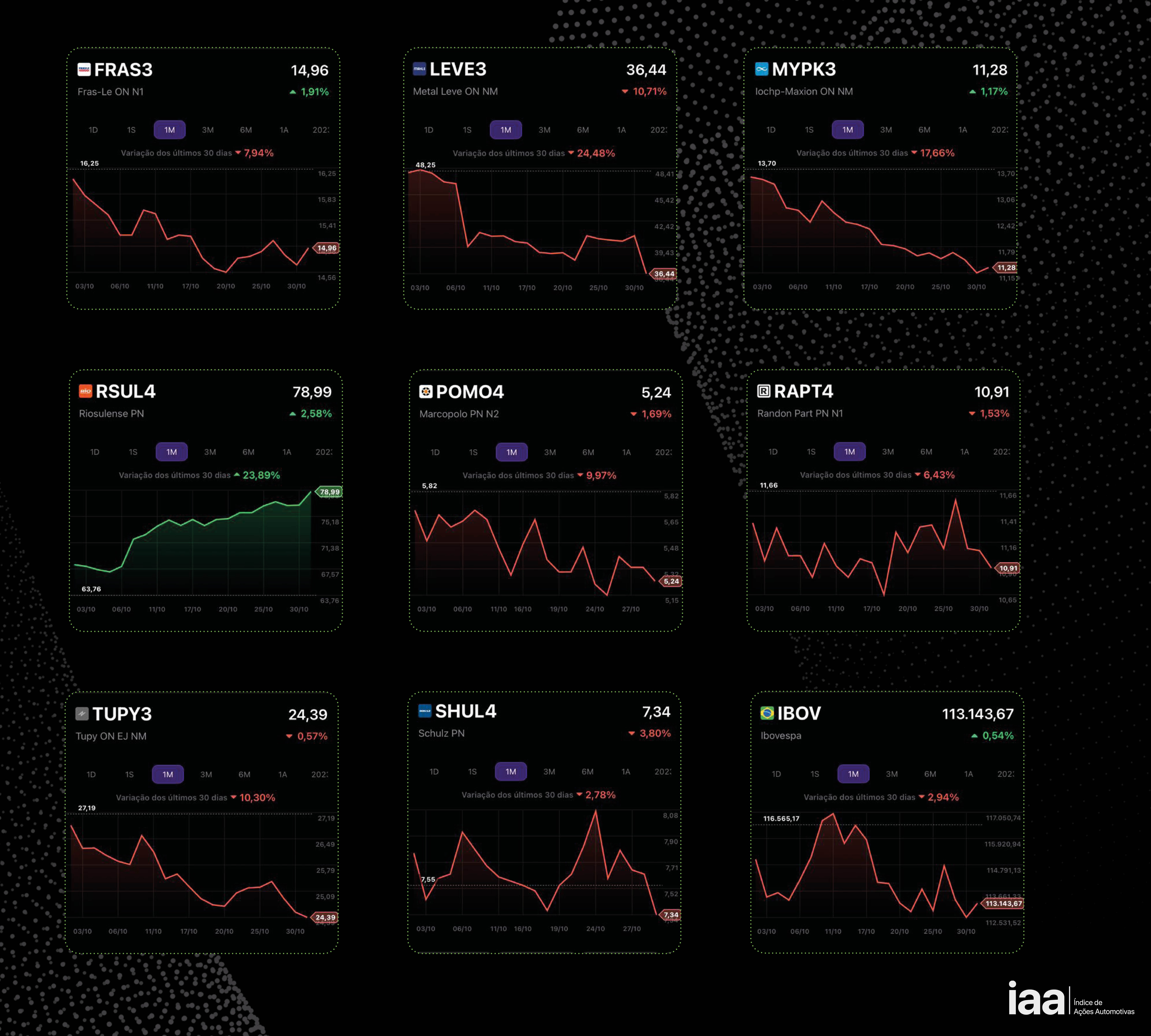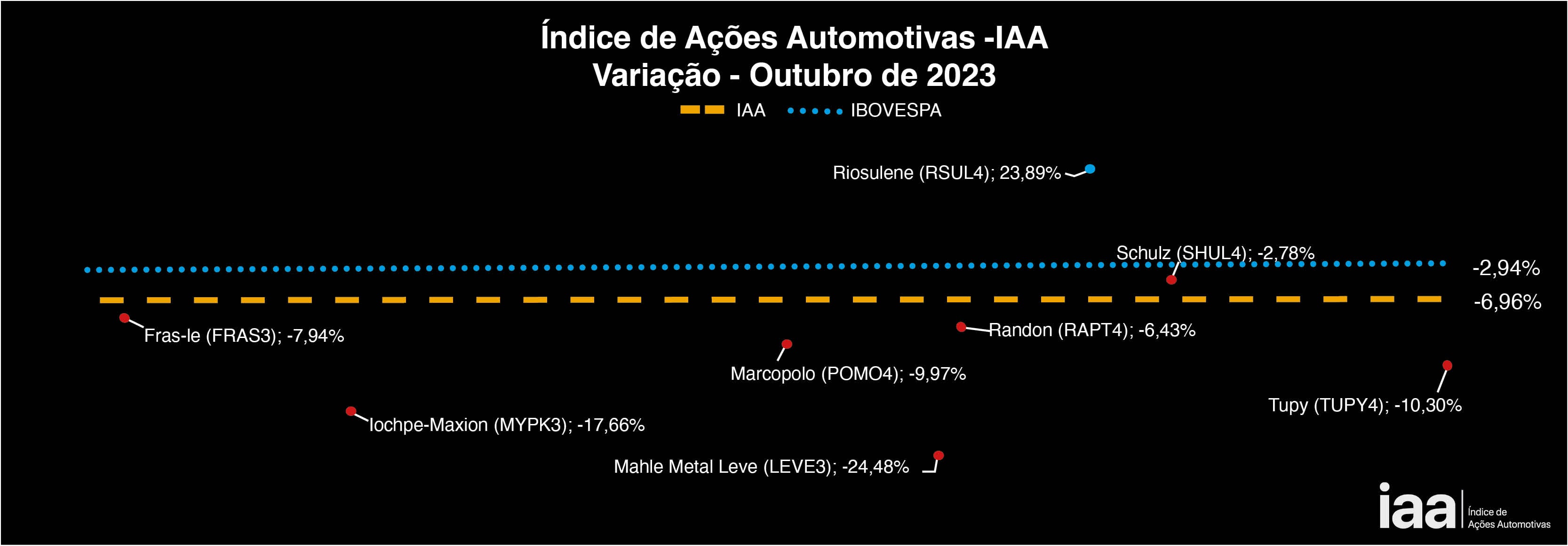 Em outubro, as ações negociadas na Bolsa de Valores de São Paulo amargaram sucessivos resultados negativos. De acordo com especialistas em mercado financeiro, dos 21 pregões ocorridos no mês, 12 sessões foram de baixa. O Ibovespa encerrou com variação negativa de -2,94%; enquanto o IAA, índice que mede o desempenho das ações automotivas em -6,96%.