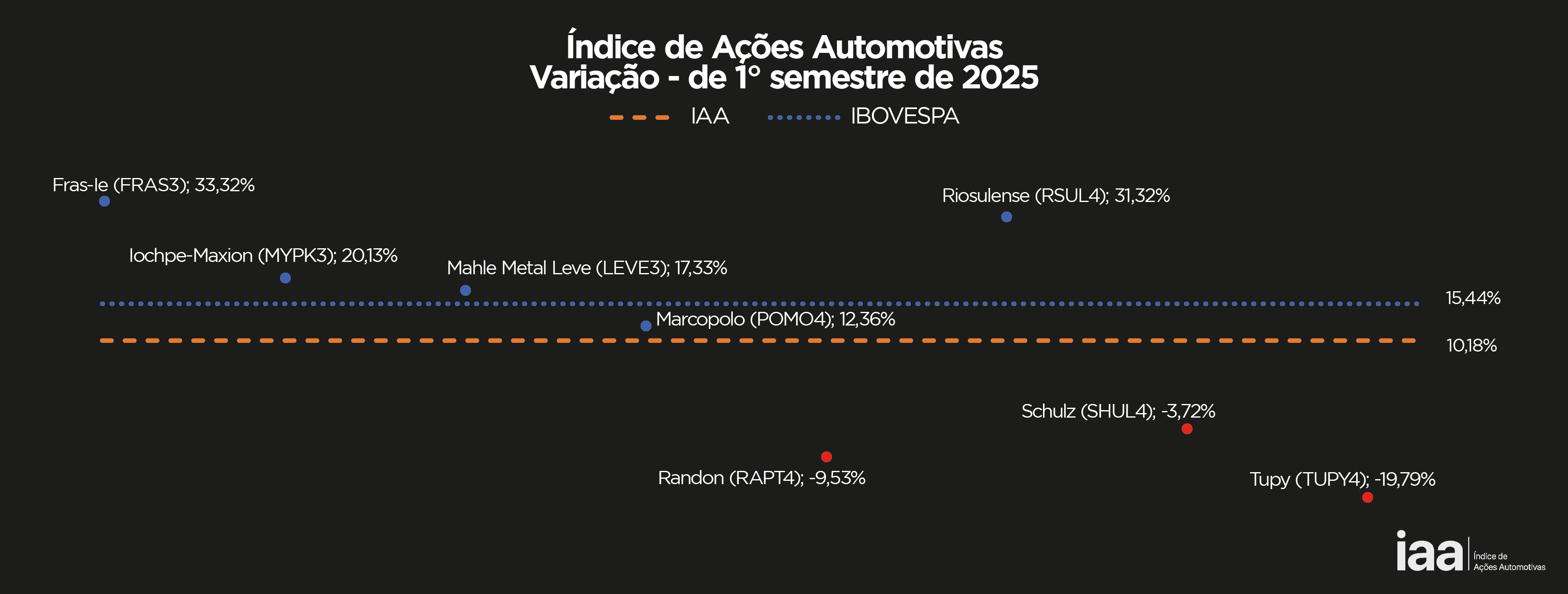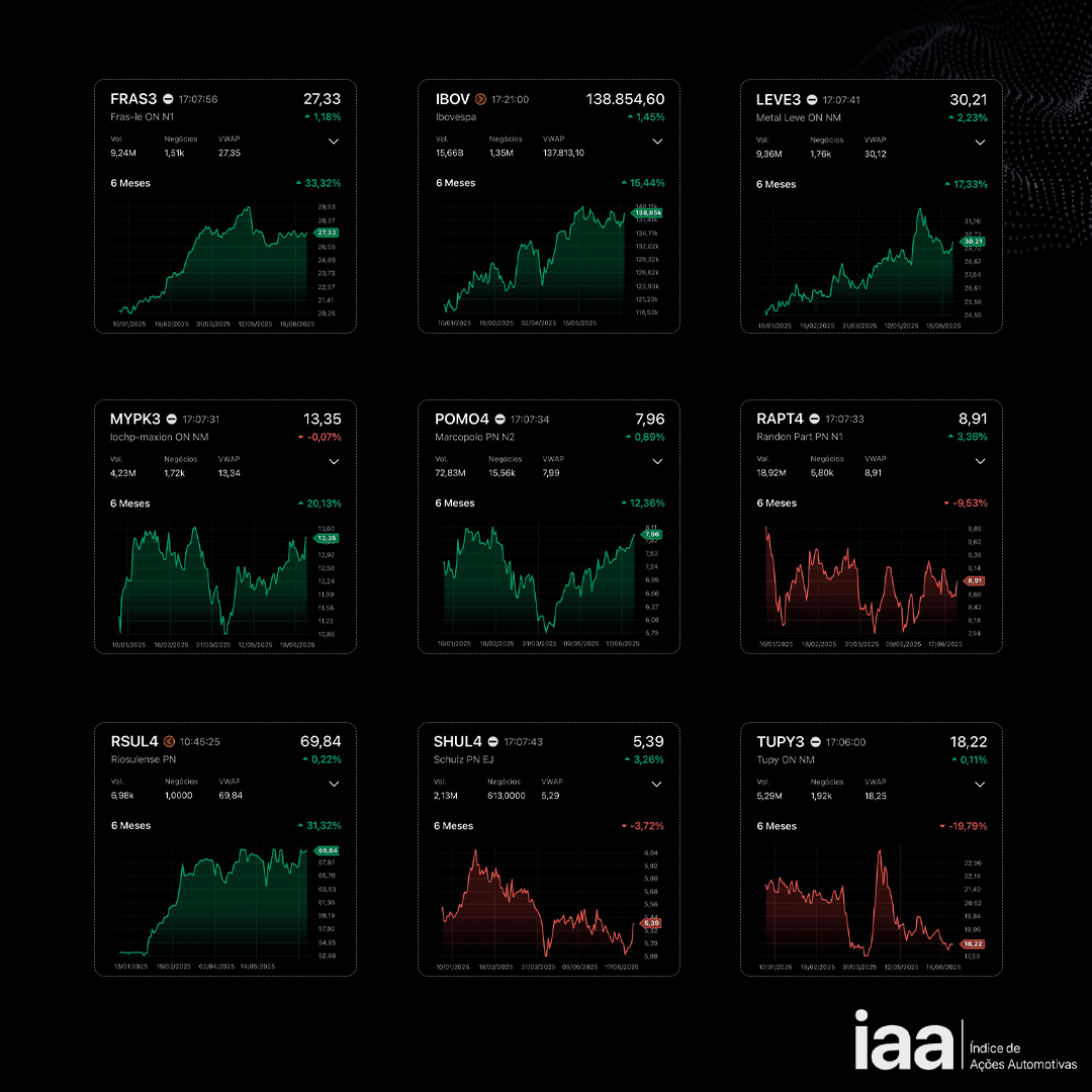 O Ibovespa, Índice de referência do mercado acionário brasileiro, fechou o 1º. Semestre de 2025 em alta de 15,45%, resultado sobretudo da injeção de capital externo no mercado de ações brasileiro. As ações automotivas negociadas na Bolsa também se beneficiaram desse movimento e o IAA, índice que mede o desempenho desses papéis encerrou o período também em alta de 10,18%.