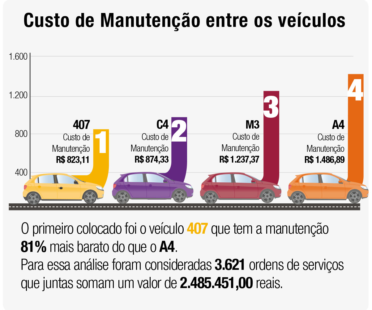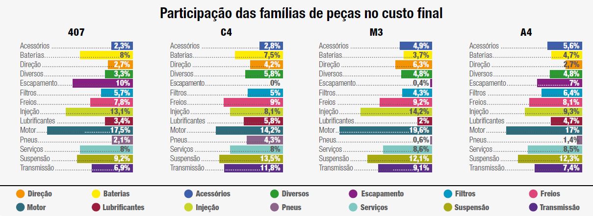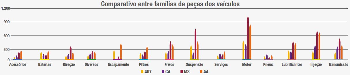 Os carros franceses têm fama de manutenção cara e difícil, mas no comparativo com os sedãs premium alemães Audi A4 e BMW M3 eles levam vantagem. Neste mês, o embate inclui, além destes dois, também o Peugeot 407 e o Citroën C4. O primeiro colocado foi o 407, que tem a manutenção 81% mais em conta que o A4. Para essa análise foram consideradas 3.621 ordens de serviços que juntas somam um valor de 2.485.451,00 reais.