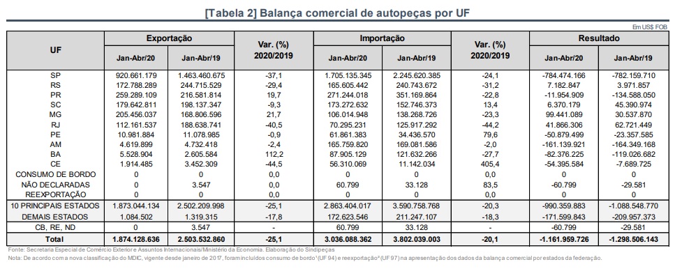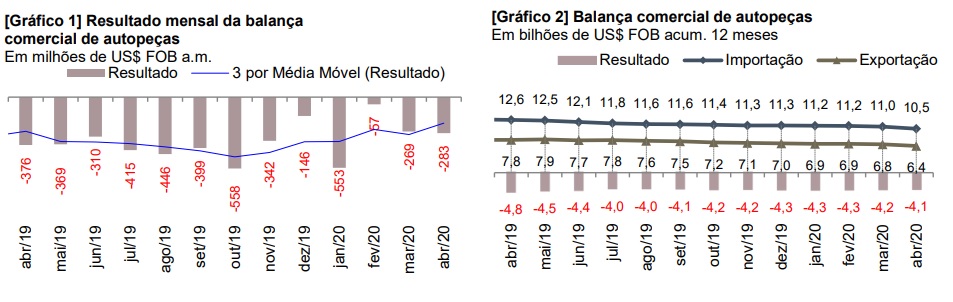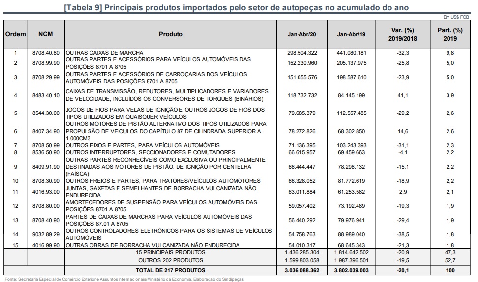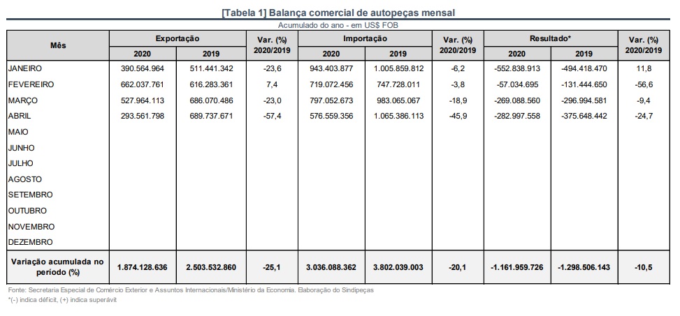 Os embarques de autopeças no acumulado de janeiro a abril deste ano, para 182 mercados, somaram US$ 1,87 bilhão, valor 25,1% inferior ao registrado em igual período de 2019, segundo dados do Ministério da Economia consolidados pelo Sindipeças. As importações, de 155 diferentes origens, foram 20,1% menores e totalizaram US$ 3,03 bilhões. Com esses resultados, o déficit comercial de autopeças foi de cerca de US$ 1,16 bilhão, 10,5% menor que o registrado em igual período de 2019. A Argentina ocupou o primeiro lugar na lista de destinos das exportações e a China, o topo do ranking de origem das importações.