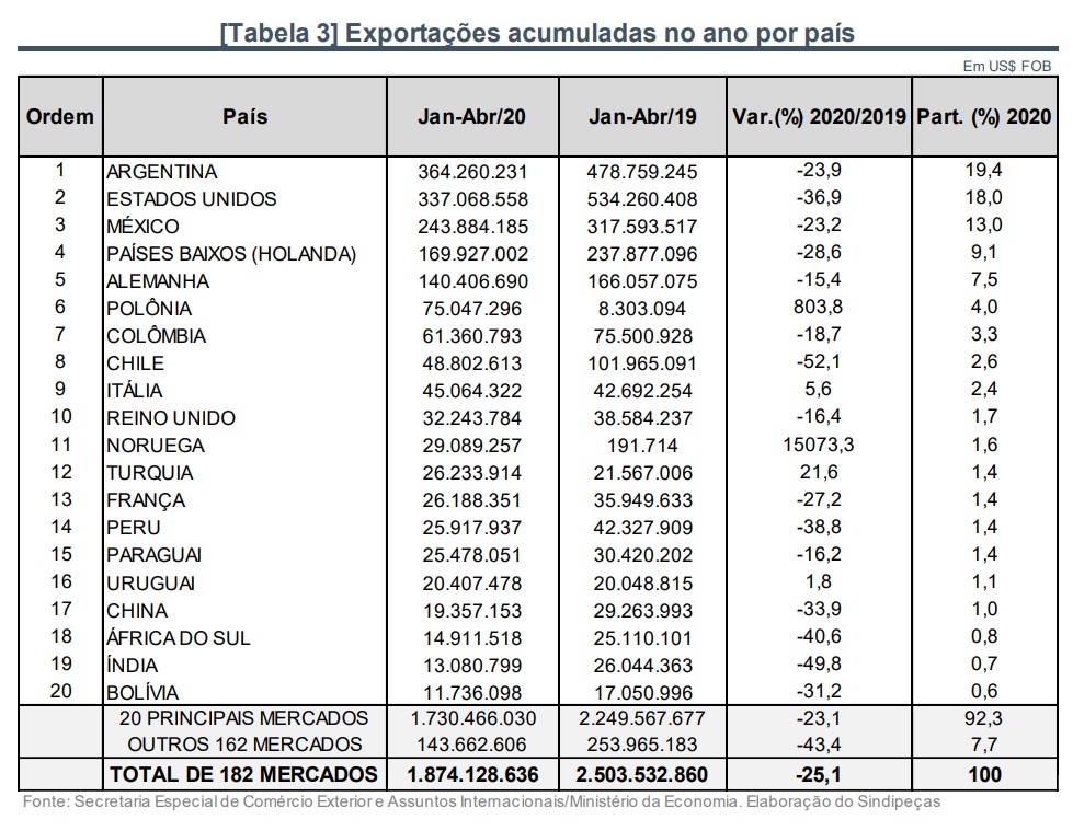 · Os principais mercados para as exportações brasileiras de veículos e autopeças seguem em retração ou ritmo muito lento. No rol dos principais parceiros comerciais (Argentina, EUA, Alemanha, México, Chile, Colômbia, por exemplo), a redução das vendas acumuladas até abril, frente a igual período do ano anterior, variou entre 15,0% e 53,0%. Por isso, o montante total das transações de autopeças com o exterior encolheu 25,1% no acumulado até abril, comparado ao mesmo período de 2019.