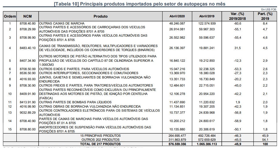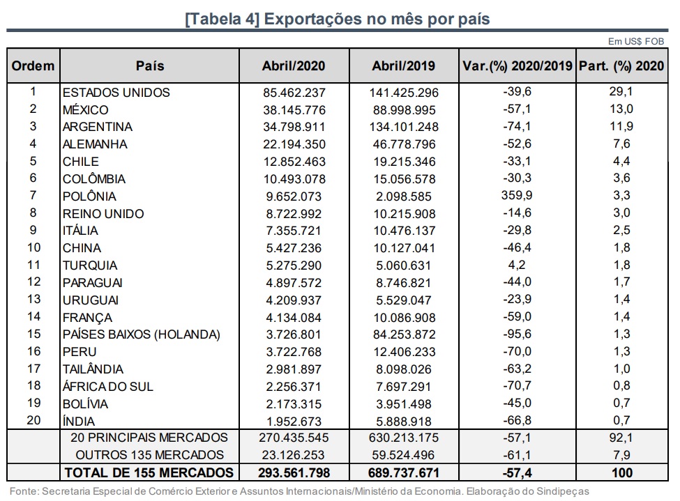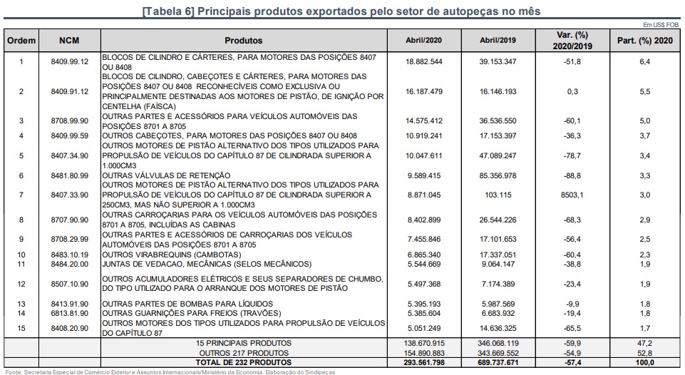 · O fechamento das fronteiras em algumas nações, as restrições ao transporte de carga e a determinação de isolamento social, principalmente nos EUA e Europa, alcançaram em cheio as exportações de autopeças em abril. A queda de 57,4% em comparação ao mesmo mês do ano anterior mais que dobrou frente à variação observada em março, quando houve retração de 23,0% para a mesma base de comparação.