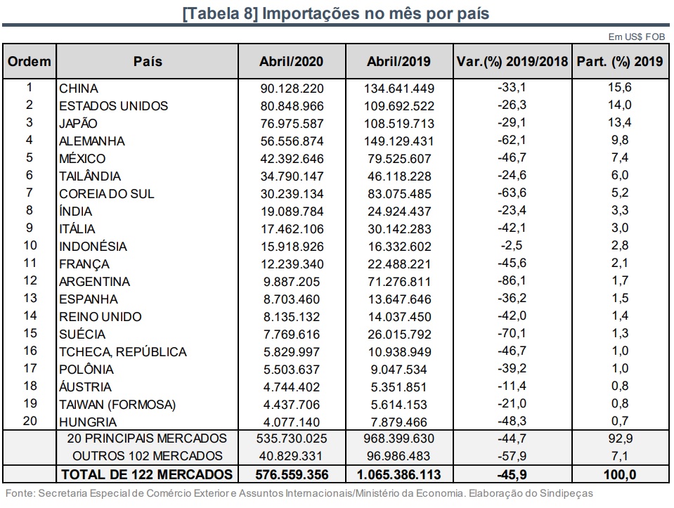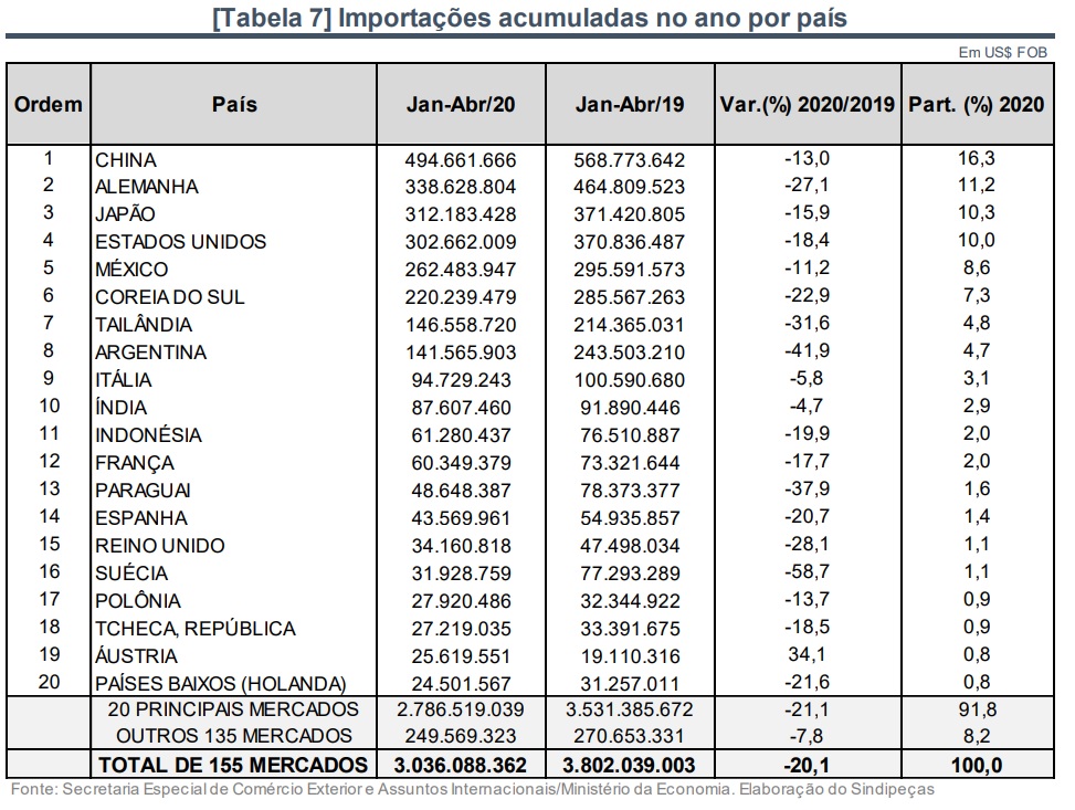 · As importações acompanharam a toada do mercado, condicionadas pelo fechamento das unidades automotivas e de autopeças em abril. Frente à igual mês de 2019, houve expressivo recuo de 45,9%, ao passo que em relação a março último, anotou-se queda de 27,7%. Os principais mercados das importações de autopeças foram afetados, com quedas que alcançaram 86% entre março/20 e abril/20, como no caso da Argentina. Até abril, as importações sofreram redução de 20,1%, totalizando US$ 3,0 bilhões. Por haver maior dependência, as importações provenientes da China apresentaram retraimento menor (-13,0%), comparado às dos demais mercados relevantes.