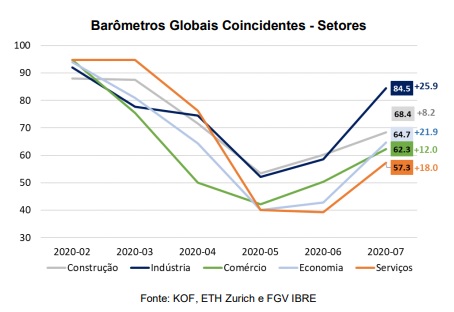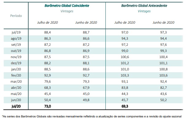 O Barômetro Global Coincidente subiu 22,6 pontos em julho na comparação com o mês anterior, ao passar de 50,4 pontos para 73,0 pontos.