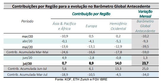 O Barômetro Antecedente Global antecipa os ciclos das taxas de crescimento mundial entre três a seis meses. Todas as regiões contribuíram para a alta do indicador em julho, com a região do Hemisfério Ocidental sendo responsável por quase 60% da evolução mensal. O aumento do otimismo com a recuperação da economia levou o indicador da região a contribuir com 14,0 pontos para a alta de 23,7 pontos do Barômetro Antecedente em julho. O Barômetro Antecedente da Europa contribuiu com 8,9 pontos, enquanto a região da Ásia, Pacífico e África contribuiu com 0,8 ponto para o indicador global, possivelmente refletindo a preocupação com uma possível segunda onda de covid-19.