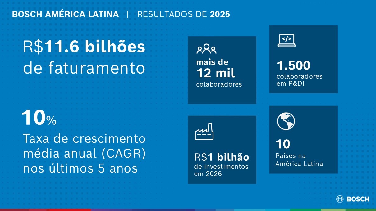 A Bosch, líder global no fornecimento de tecnologias e serviços, fechou o ano fiscal de 2025 com vendas totais de 11,6 bilhões de reais na América Latina, incluindo as exportações e as vendas das empresas coligadas. Esse número representa um crescimento de 7,6% em relação ao ano anterior. Com mais de 11.000 colaboradores, o Brasil representou 80% do faturamento, o equivalente a 9,4 bilhões de reais no ano passado. Mais de 20% desse valor veio de exportações para outros países da América Latina, Europa e América do Norte.