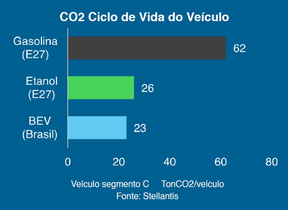 Considerando todos os elementos desse complexo ecos – sistema, o resultado é praticamente um empate no total de emissões de CO2 entre o elétrico e o híbrido a etanol, considerando o ciclo de vida dos veículos.