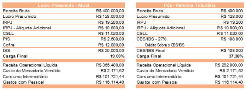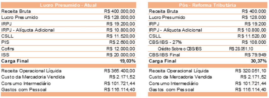 Simulação de empresa do setor de serviços com receita mensal de R$ 400 mil enquadrada no lucro presumido e alíquota-padrão do IBS e da CBS