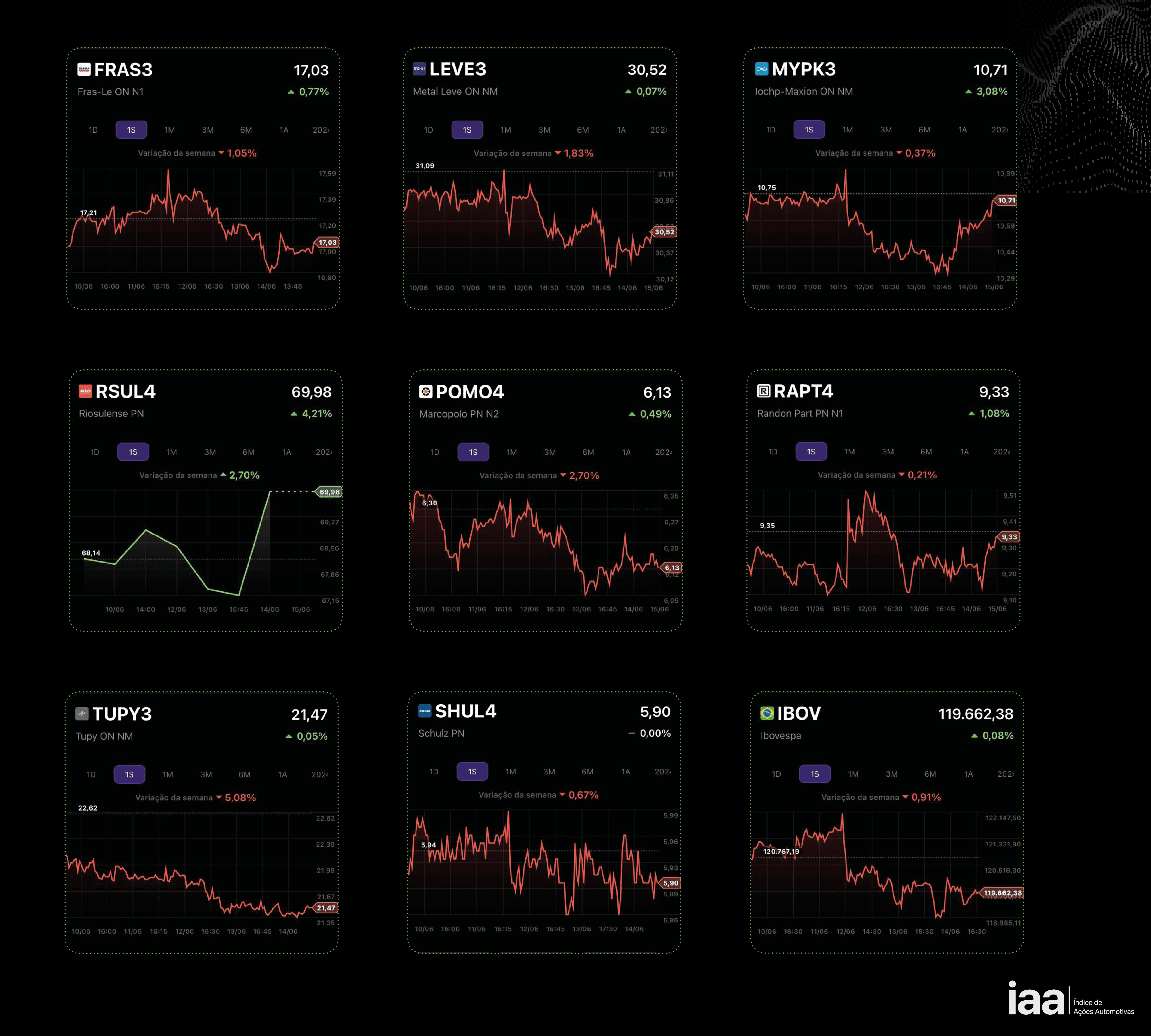 Com exceção das ações da Riossulense (RSUL4) que registraram crescimento de +2,70%, os demais títulos negociados sofreram desvalorização de 10 a 14 de junho: Randon (RAPT4) -0,21%; Iochpe -Maxion (MYPK3) -0,37%; Schulz (SHUL4) -0,67%; Fras-le (FRAS3) -1,05%; Mahle Metal Leve (LEVE3) -1,83%; Marcopolo (OPOMO4) -2,70% .
