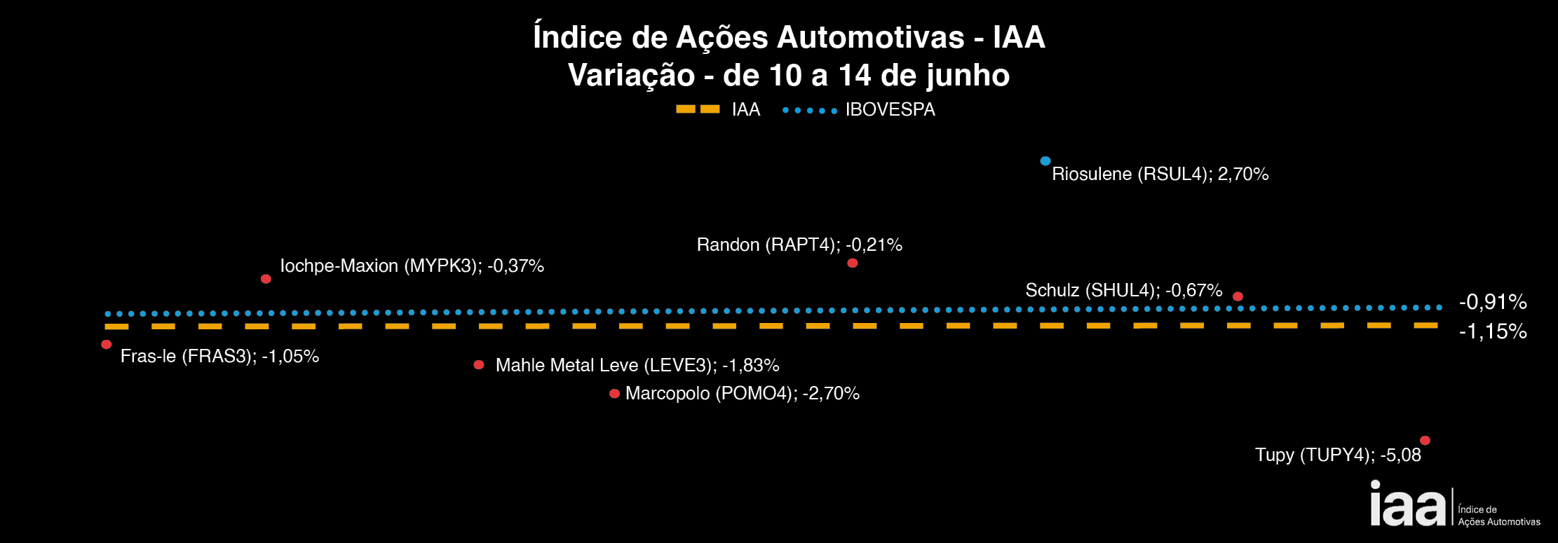 Os pregões realizados na Bolsa de Valores de São Paulo na semana de 10 a 14 de junho não foram suficientes para mudar a trajetória do IAA, que mede o desempenho das ações automotivas. Por mais uma semana, o índice encerrou o período em queda. A variação semanal ficou em -1,15%, enquanto o ibovespa -0,91%.