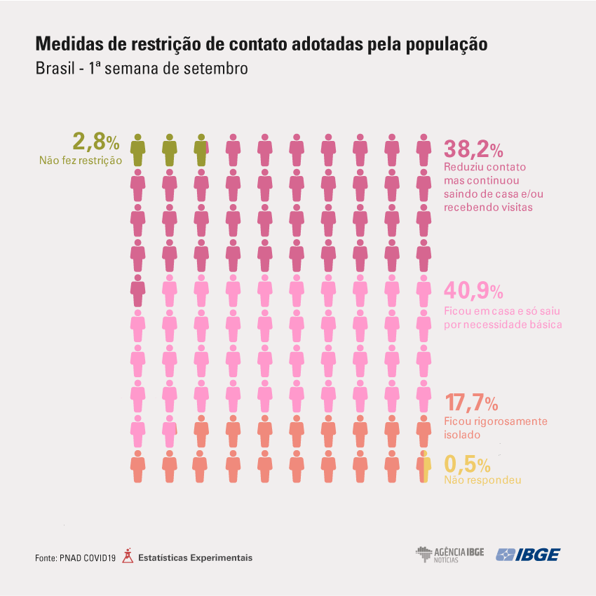 A maior parte da população (86,4 milhões), contudo, ficou em casa e só saiu por necessidade na primeira semana de setembro. Esse número, porém, teve redução de 2,2 milhões na comparação com a semana anterior. Por outro lado, aumentou em 3,6 milhões o número de pessoas que reduziu o contato, mas continuou saindo de casa ou recebendo visitas (80,7 milhões).