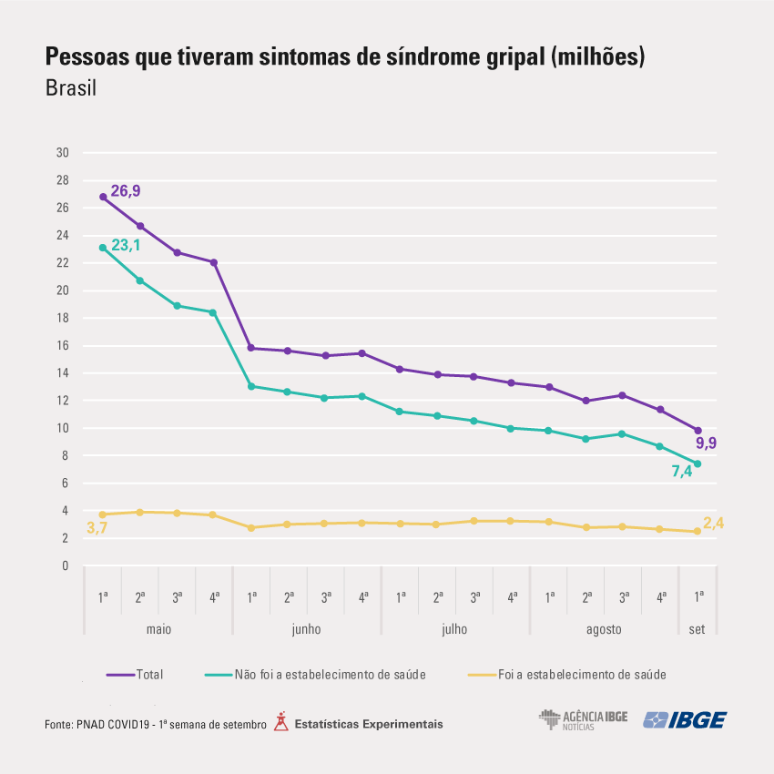 Maria Lucia também destaca a redução de 1,4 milhão no número de pessoas que tiveram algum sintoma relacionado à síndrome gripal na primeira semana de setembro (9,9 milhões), na comparação com a semana anterior (11,3 milhões). “Foi uma queda significativa nesse indicador. Houve redução em todos 12 sintomas pesquisados”, afirmou Maria Lucia. No início da pesquisa, em maio, 26,8 milhões relataram algum sintoma.