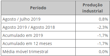 Em agosto de 2019, a produção industrial cresceu 0,8% frente a julho (série com ajuste sazonal), eliminando, assim, grande parte da perda de 0,9% acumulada no período maio-julho de 2019. Na série sem ajuste sazonal, no confronto com agosto de 2018, o total da indústria apontou redução de 2,3% em agosto de 2019, após também registrar recuo em junho (-5,9%) e julho (-2,5%).