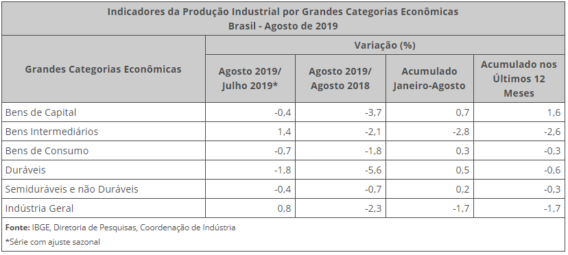 Entre as grandes categorias econômicas, ainda na comparação com o mês imediatamente anterior, bens intermediários, ao crescer 1,4%, mostrou a única taxa positiva em agosto de 2019, após assinalar queda em junho (-0,6%) e ficar estável em julho (0,0%). Por outro lado, o setor produtor de bens de consumo duráveis (-1,8%) apontou o recuo mais intenso nesse mês, após avançar 0,4% em julho de 2019, quando interrompeu dois meses consecutivos de queda na produção, período em que acumulou redução de 3,0%. Os segmentos de bens de consumo semi e não-duráveis (-0,4%) e de bens de capital (-0,4%) também assinalaram resultados negativos em agosto de 2019, com o primeiro eliminando parte do avanço de 1,3%% verificado em julho; e o segundo marcando o terceiro mês seguido de queda na produção, com perda acumulada de 1,1% nesse período.