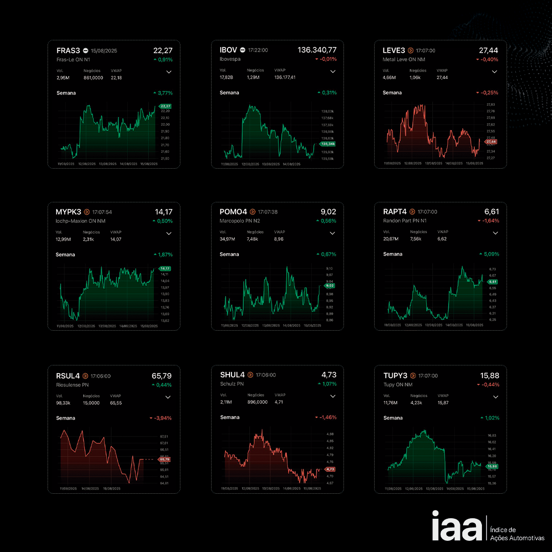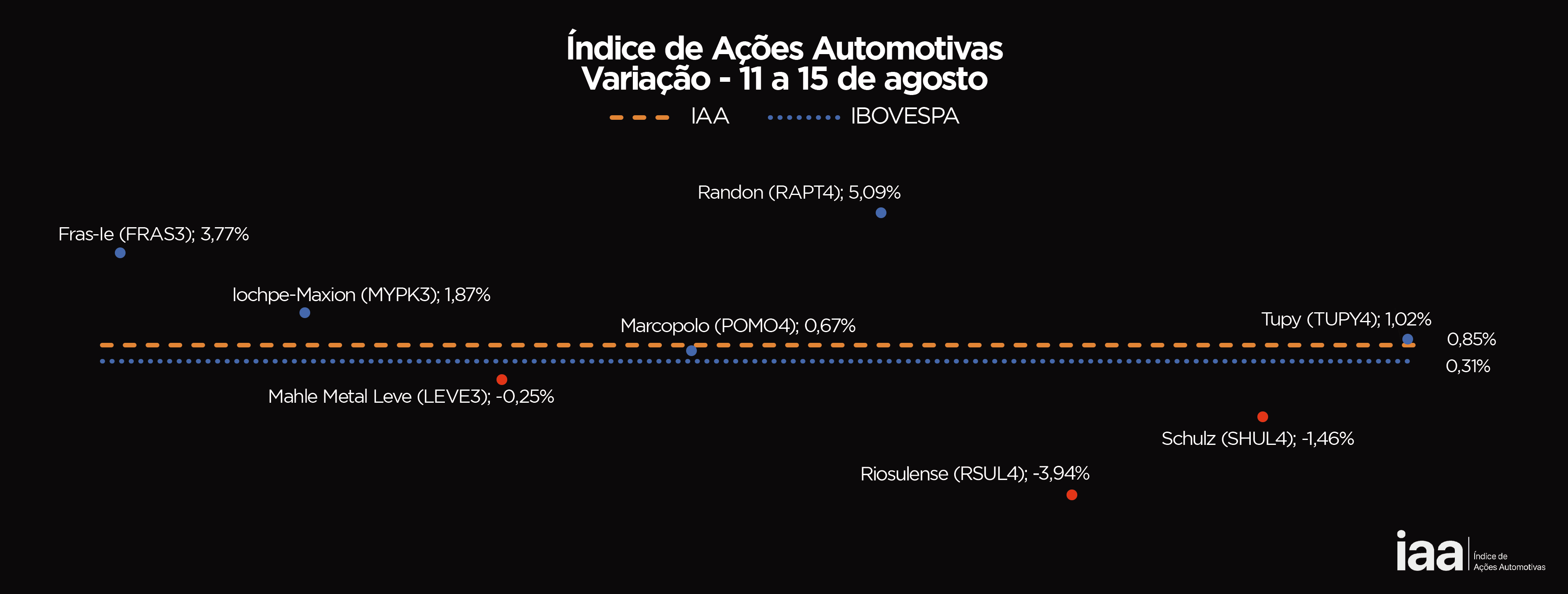 O IAA, que mede o desempenho das ações automotivas na Bolsa de Valores de São Paulo, encerrou a semana em alta de +0,85%. Com a recuperação dos ativos que compõem a carteira, o índice superou o Ibovespa, que fechou em +0,31%, ainda sob impacto das pressões internacionais.