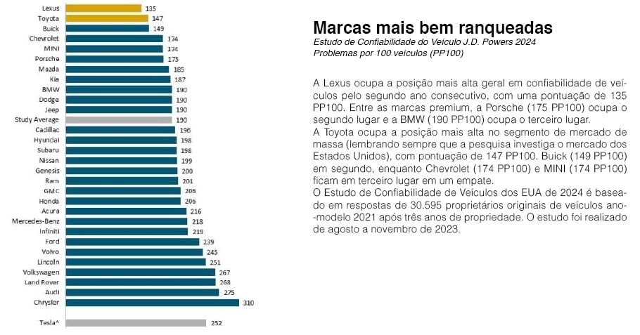O número alto de problemas encontrados pelos proprietários indica, segundo a interpretação dos especialistas da J.D. Power, uma queda na confiabilidade do veículo em longo prazo, com níveis crescentes de problemas relatados para quase dois terços das marcas incluídas no estudo. A média das marcas vem aumentando 4 problemas por 100 veículos (PP100) ano após ano, resultando no índice para 190 PP100 a partir de 2023. A taxa em que os problemas aumentaram no período entre 90 dias e três anos de utilização do carro cresceu para 17%, um aumento de 5 pontos percentuais em relação aos 12% de 2023. “(A deterioração da confiabilidade) provavelmente pode ser atribuída ao período tumultuado em que esses veículos foram produzidos, e os proprietários estão mantendo seus veículos por muito mais tempo. Na verdade, a idade média dos veículos nas vias americanas hoje é de aproximadamente 12 anos, o que ressalta a importância da construção um automóvel projetado para resistir ao teste do tempo. As montadoras devem garantir que a introdução de novas tecnologias veiculares hoje ainda vai atender às necessidades do cliente anos depois”, disse Frank Hanley, Diretor Sênior de Auto Benchmarking na J.D. Power.