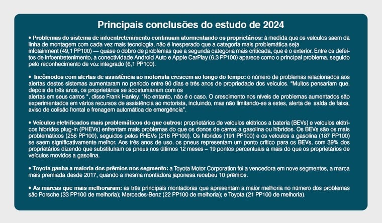 O estudo, que em 2024 chegou à 35ª edição, abrange 184 áreas problemáticas específicas em nove grandes categorias nos veículos: clima; assistência à condução; experiência de condução; exterior; características/controles/displays; infoentretenimento; interior; trem de força; e assentos.