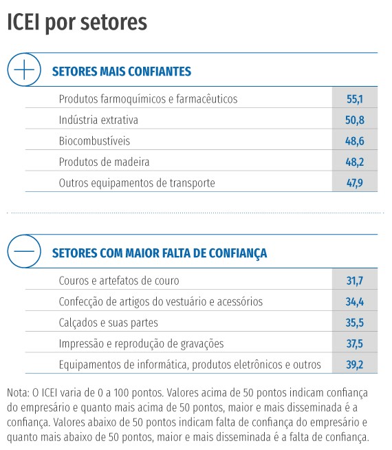 Além do setor de Farmoquímicos e Farmacêuticos, podemos destacar positivamente, os setores de Biocombustíveis (com ICEI de 48,6 pontos), Produtos de Madeira (48,2 pontos), Outros equipamentos de transporte (47,9 pontos) e Produtos alimentícios (47,3 pontos), cujo indicadores refletem a menor falta de confiança entre os setores da indústria de transformação. O pessimismo é maior entre os empresários dos setores Couros e artefatos de couro (31,7 pontos), Vestuário e acessórios (34,4 pontos) e Calçados (35,5 pontos).