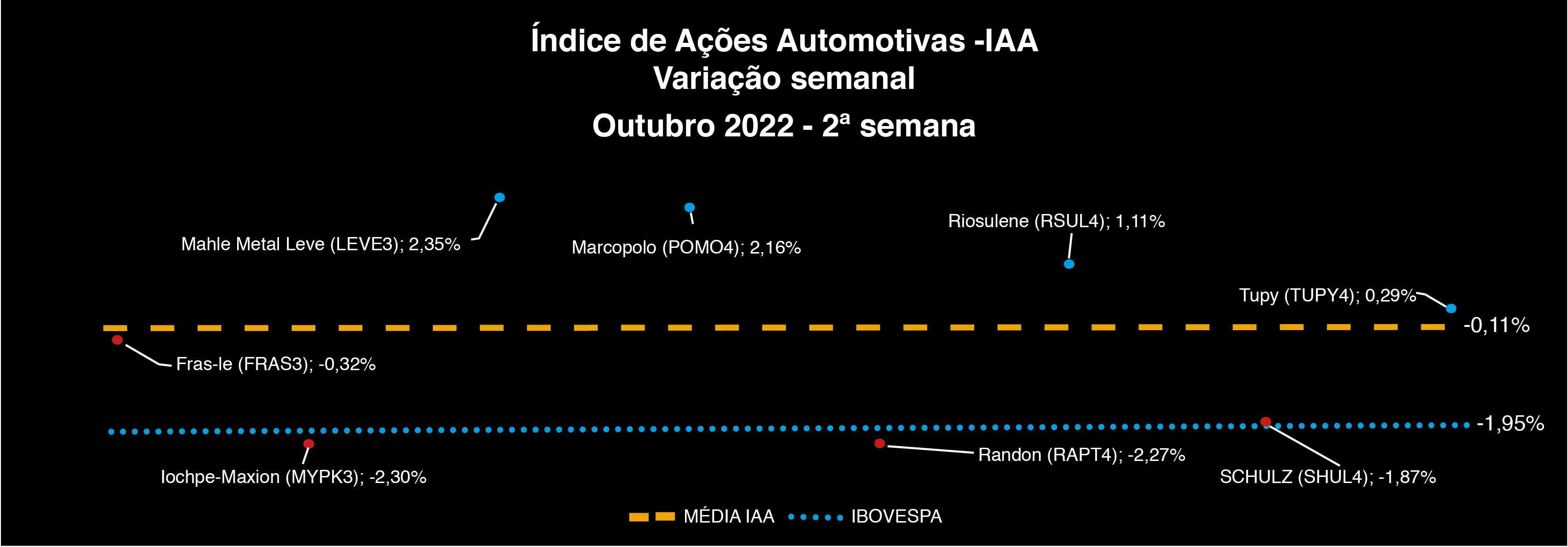 Na segunda semana de outubro, as ações automotivas listadas na Bolsa de Valores registraram uma média negativa de -0,11%. Apesar do resultado, o IAA (ìndice de Ações Automotivas) sinaliza os desempenhos positivos nas ações da Mahle Metal Leve (LEVE3) 2,35%; Marcopolo (OPOMO4) 2,19%; Riosulense. (RSUL4) 1,11% e Tupy ( TUPY4) 0,11%.