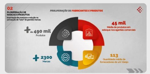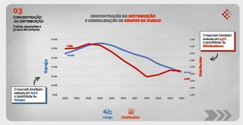 O terceiro e o quarto movimentos estão diretamente ligados ao desenvolvimento dos agentes comerciais, tanto o número de varejos, quanto de distribuidores de autopeças, que ano após ano vem reduzindo, fenômeno que só pode ser explicado pela concentração com fusões e aquisições pelo lado dos distribuidores e pelo processo de agrupamento em redes e crescimento de tamanho dos varejos tradicionais e surgimento dos atuais “atacarejos”, ou seja, agentes com projeção de compra em atacado, mas que realizam suas vendas diretamente ao aplicador/ consumidor final. Se analisarmos os grandes centros urbanos, cada vez é mais raro encontrarmos as antigas e famosas “autopeça de bairro”; em contrapartida, os varejos mais tradicionais foram se transformando em grandes lojas (atacarejos) ou já contam com mais de 1 filial e centros de distribuição espalhados pelas cidades. Sem contar o surgimento a e vinda das redes estrangeiras para o mercado nacional ou no modelo de negócios adotado pelo grupo Advent International, que hoje já conta com mais de 200 lojas.