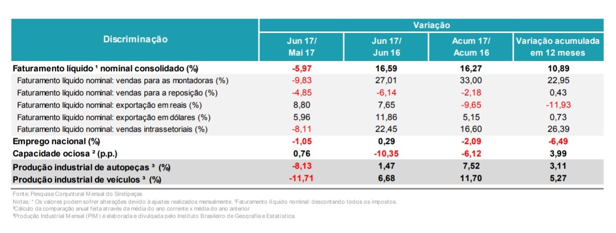 O faturamento líquido nominal do setor de autopeças no primeiro semestre cresceu 16,3% sobre o registrado em igual período de 2016, segundo levantamento mensal com 64 empresas associadas ao Sindipeças que representam 32,2% das vendas totais do setor de autopeças no Brasil. O aumento ocorreu em todos os segmentos de mercado (montadoras, reposição e intrassetorial), com exceção das exportações em reais, que caíram 9,7%, devido à valorização da moeda local, embora tenham crescido 5,2% em dólares. O nível de utilização da capacidade manteve-se estável em 66% em junho. Quanto ao número de empregados, houve redução de 2,1% de janeiro a junho, sobre os mesmos meses do ano passado.