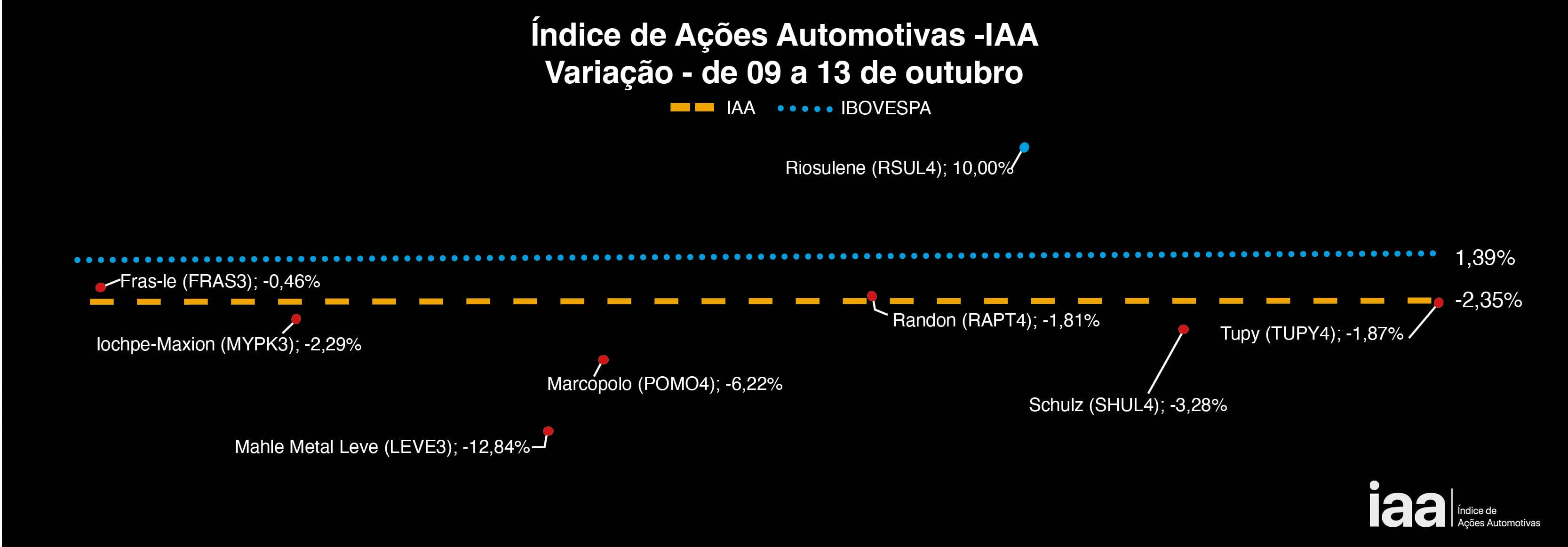 As ações automotivas negociadas na Bolsa de Valores de São Paulo sofreram forte desvalorização de 09 a 13 de outubro, encerrando o período com variação negativa de -2,35%. O efeito calendário, já que houve um feriado no meio dessa semana, somado ao cenário turbulento no exterior com a crise na Faixa de Gaza e as incertezas diante da política de juros norte-americana contribuíram para o resultado.